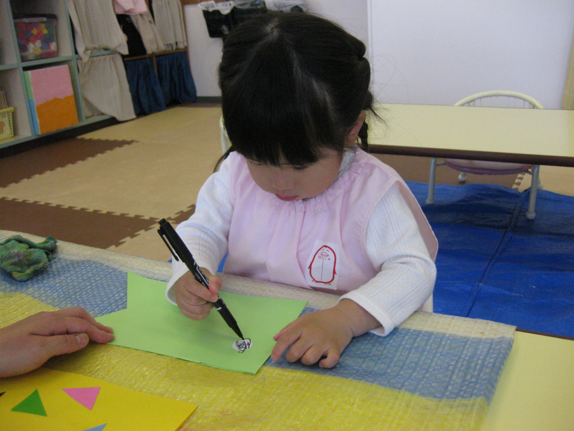 「白いお目目の中に、描いてみようね」と伝えると、はみ出さないように、気をつけながら描いていましたよ🖊