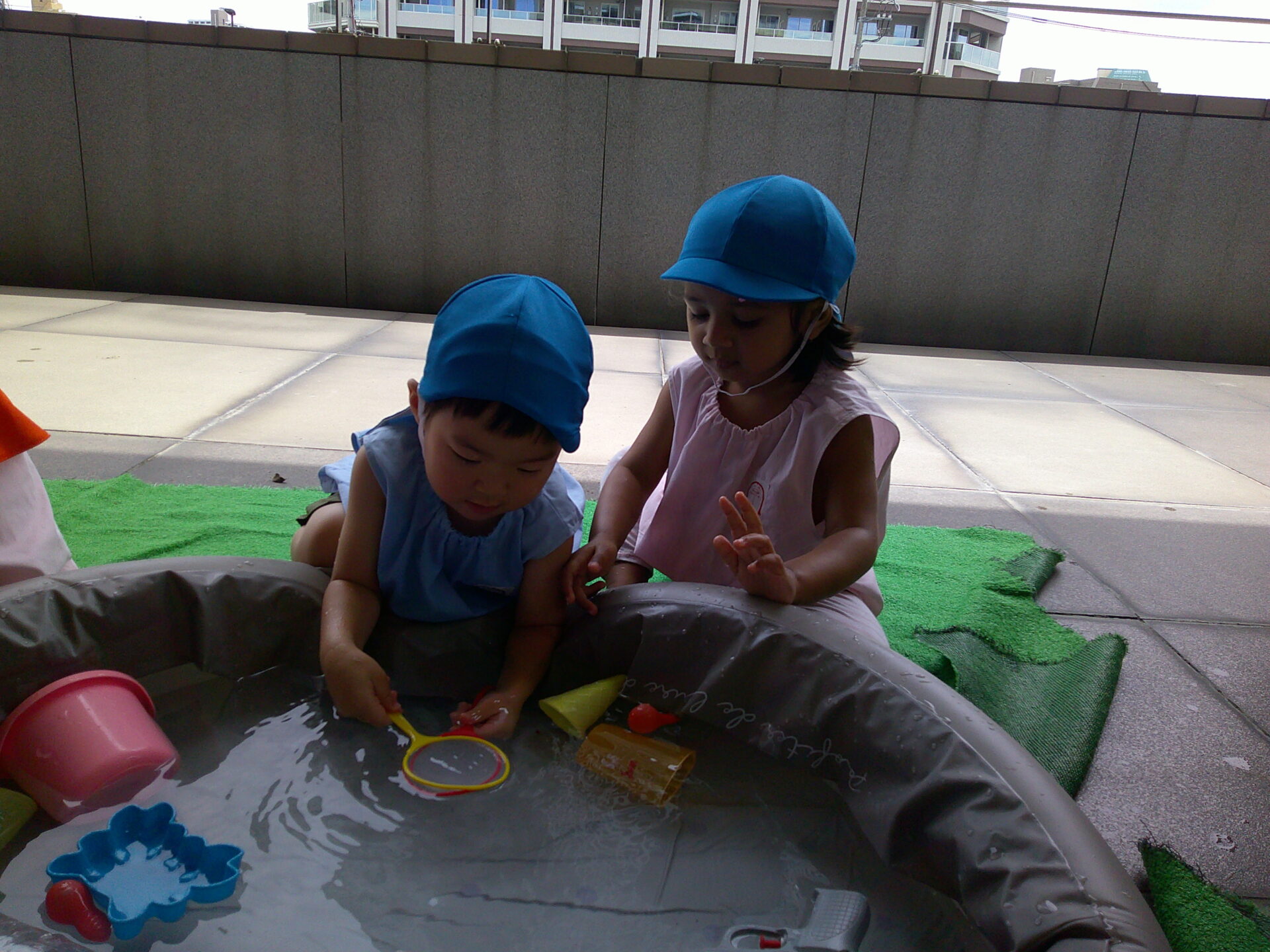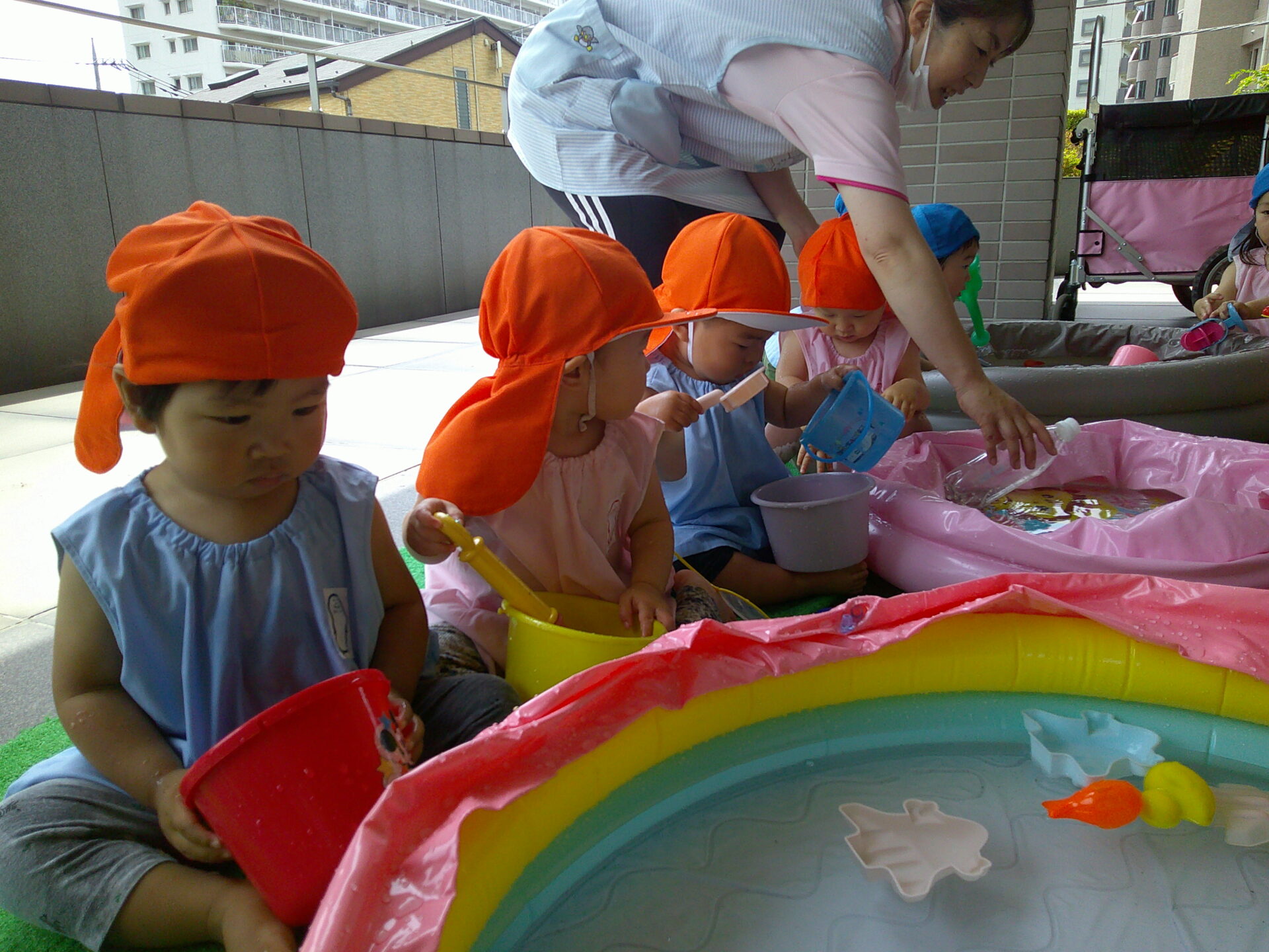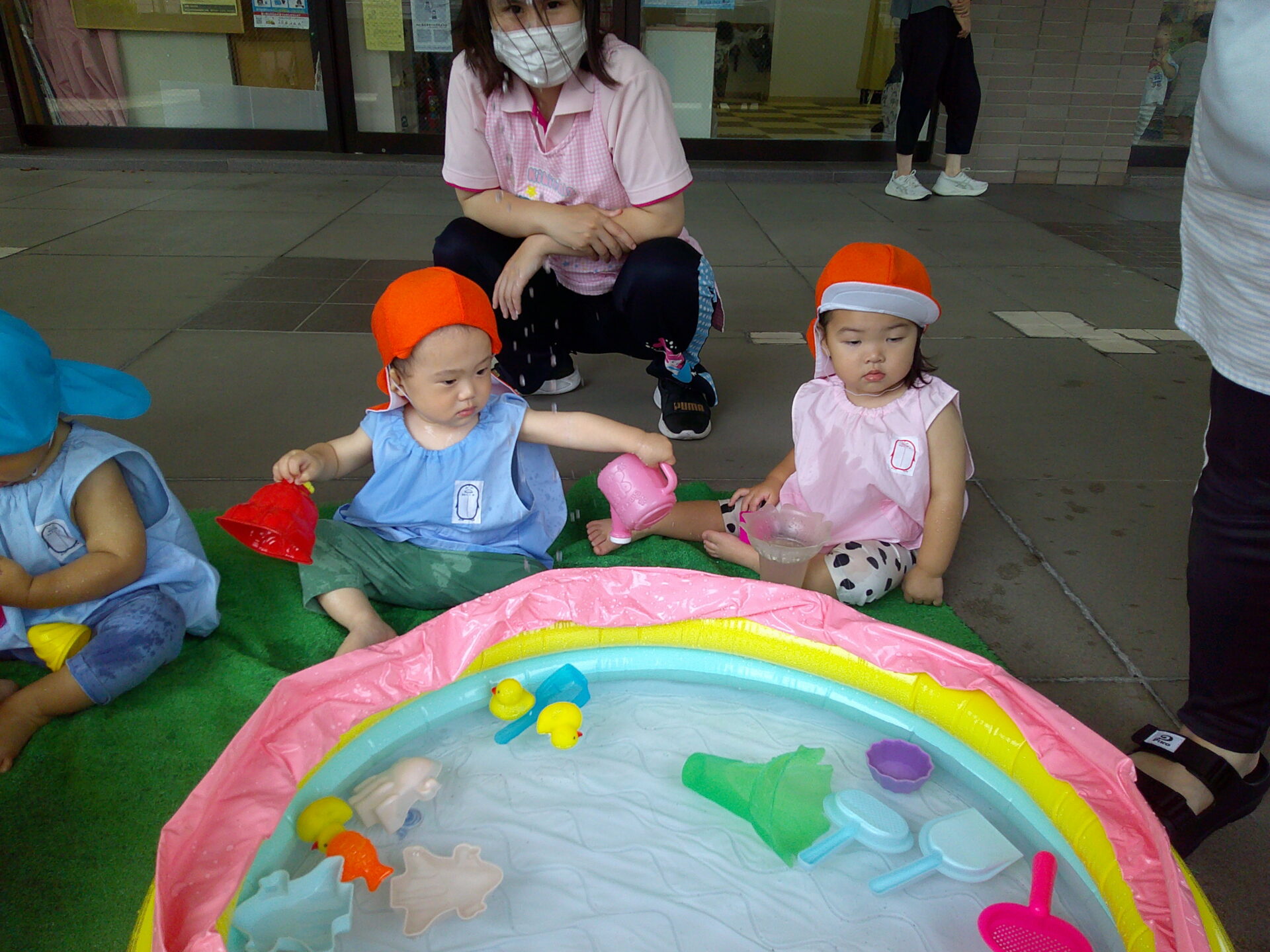 今日はプール開きでしたよ。早速初日、お水遊びをしました♬