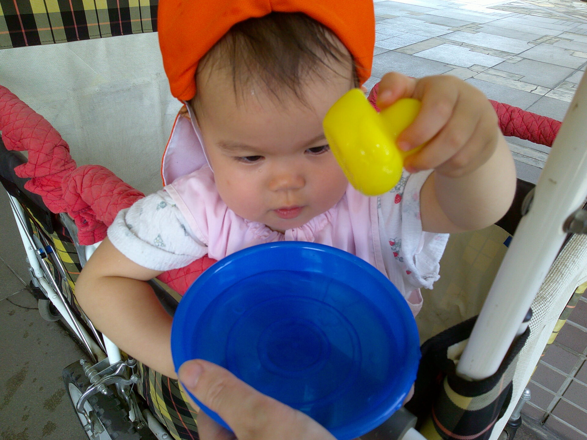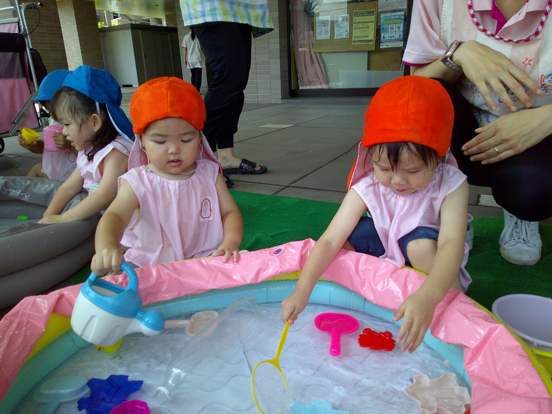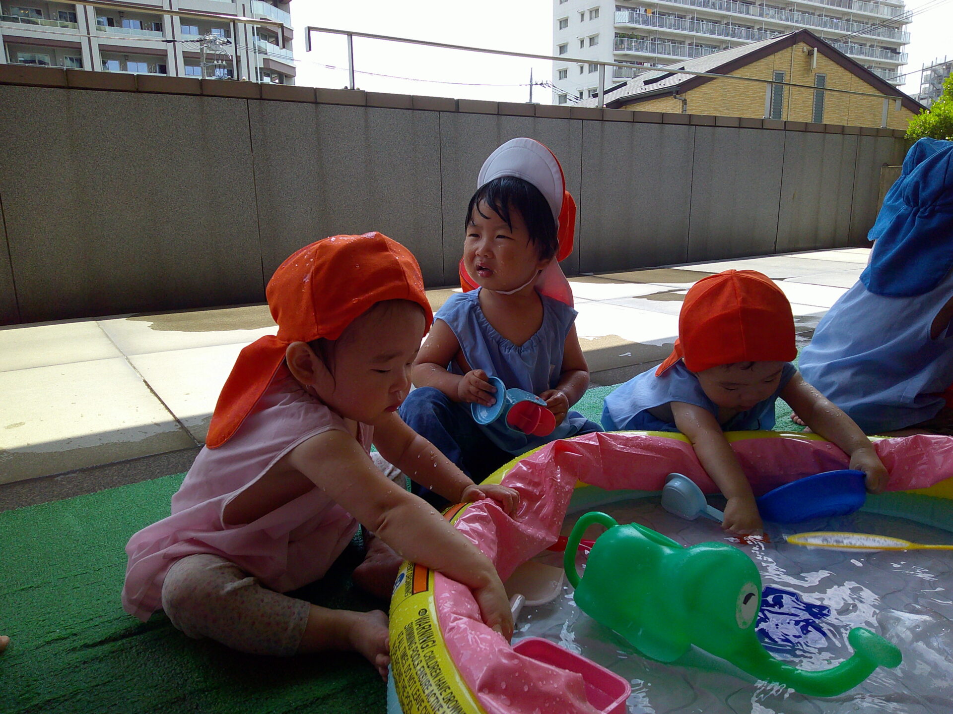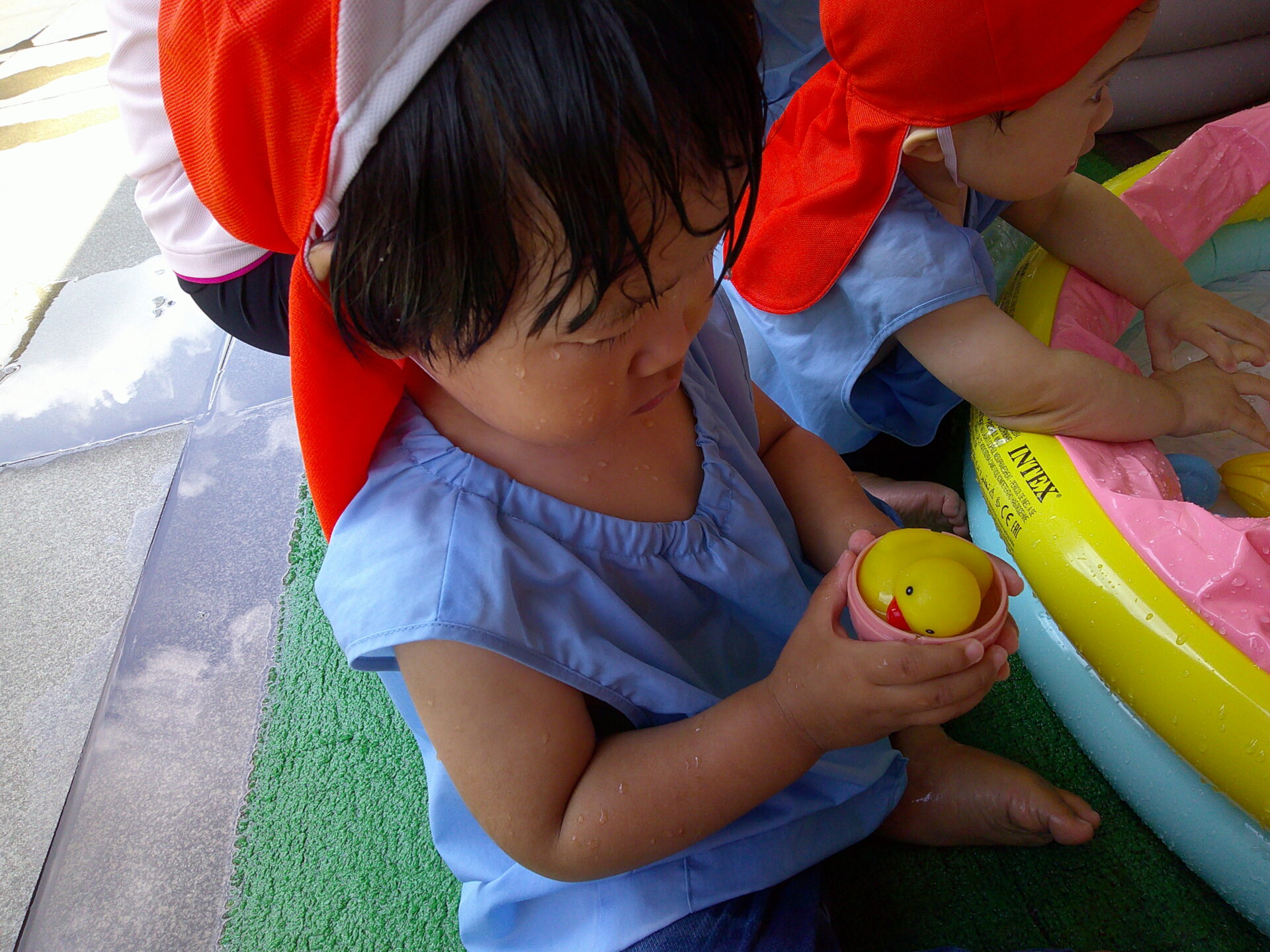 お水をかけられるのが止まると、手をプールのお水の中に入れてぱしゃぱしゃして、「お水もっと!!足りない!!」と言っているようでした(笑)