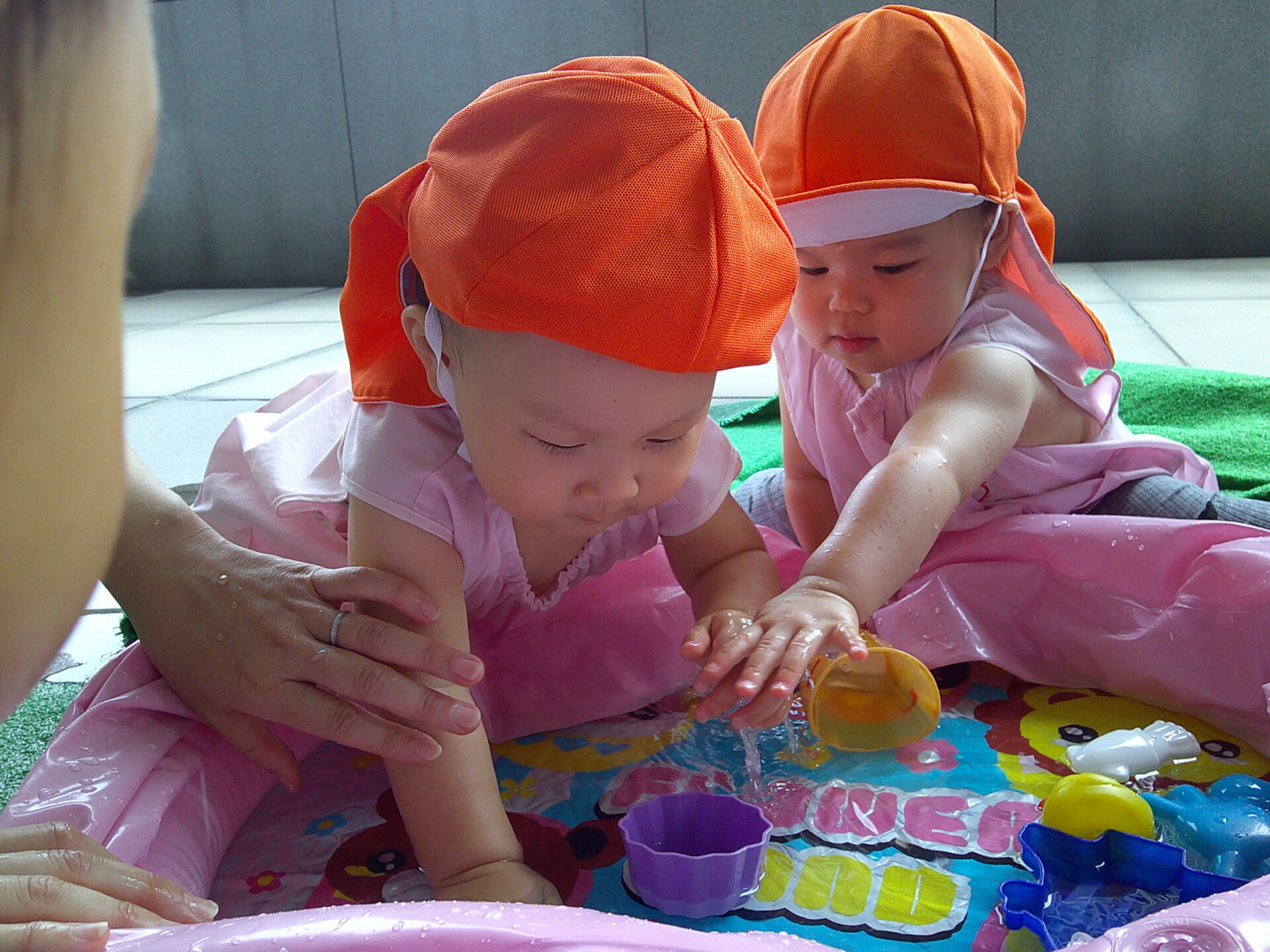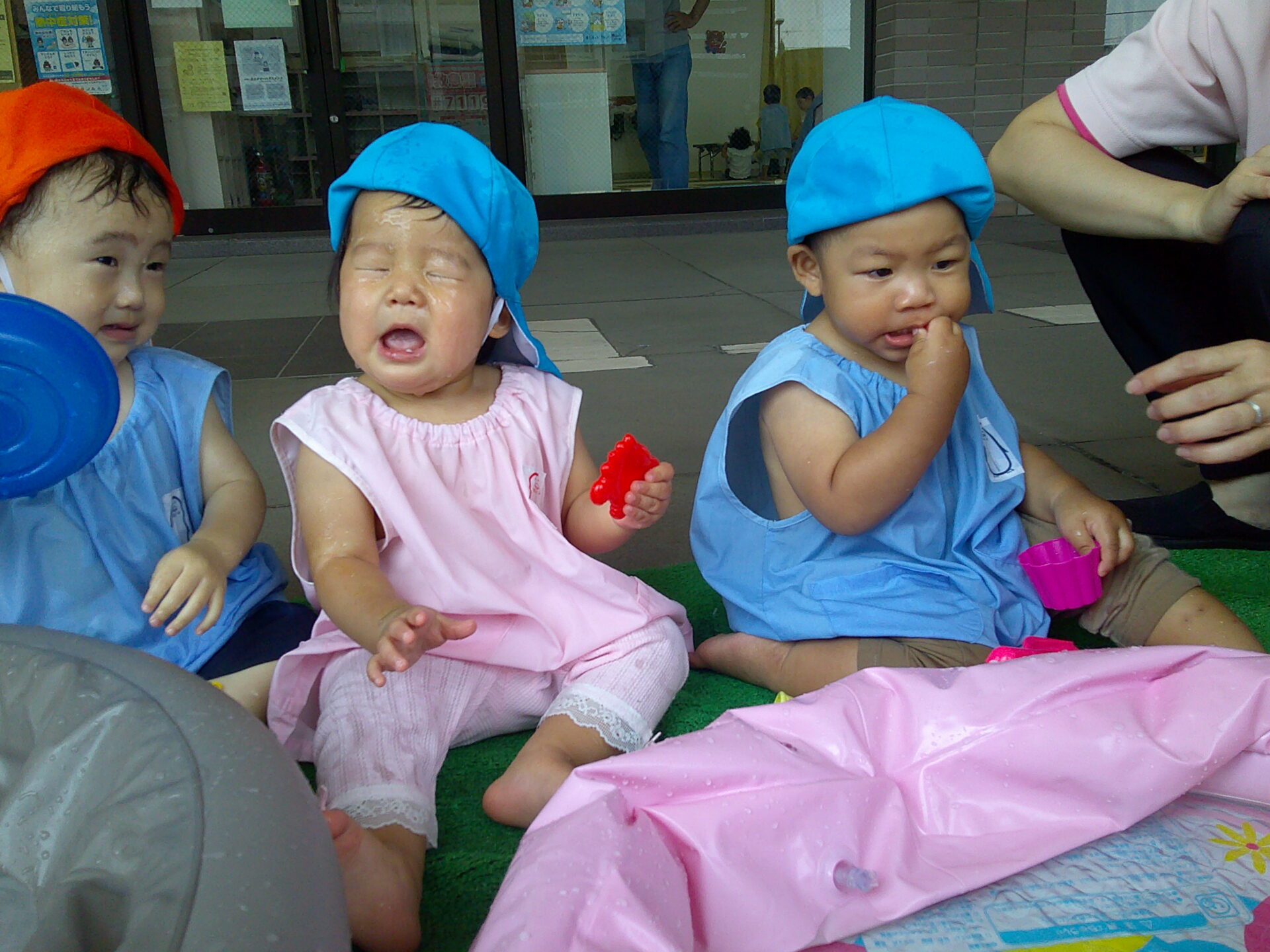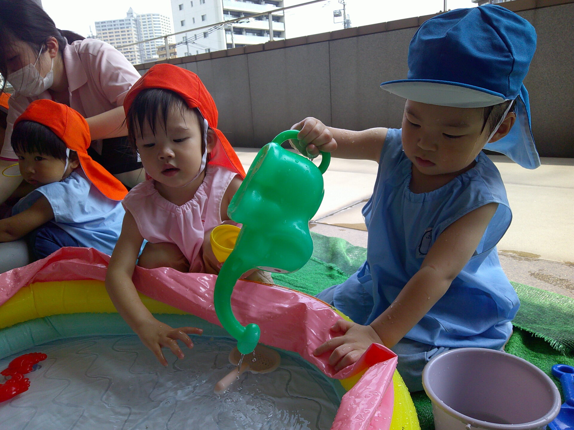 また、先生と一緒にバシャバシャやって楽しんでいるお友達や水鉄砲を使ったり、バケツに水を汲んで冷たさに笑顔ではしゃいで遊んでいるお友達もいました。