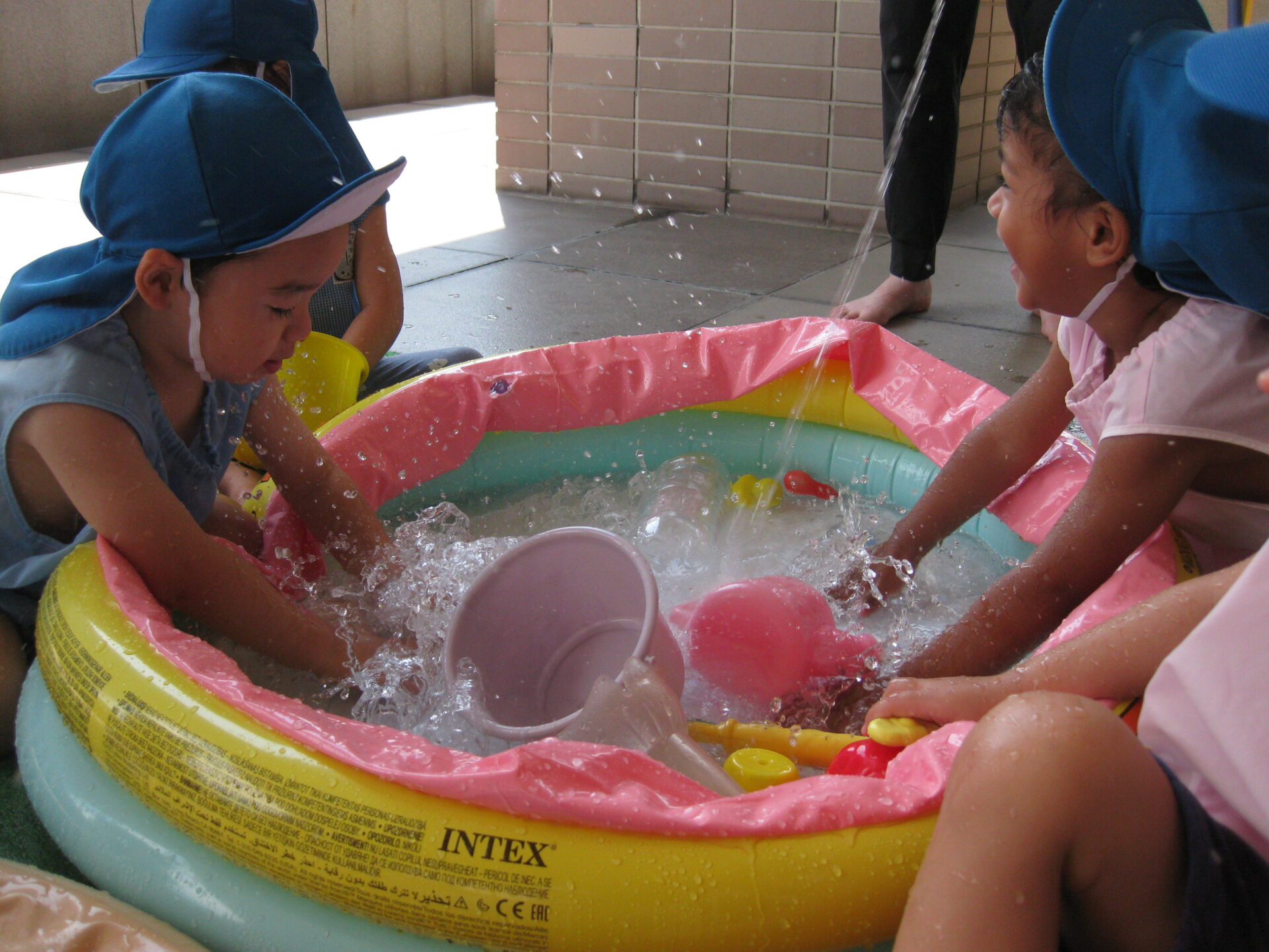 シャワーホースをジェット噴射の強さにして、プールの中にお水がビューーーッッと溜められていくと大喜びし始めるお友だちもいました😊気持ちがどんどん高ぶり、バシャバシャバシャバシャと両手でかけあいっこに!!たくさん濡れて気持ち良さそうでしたよ。