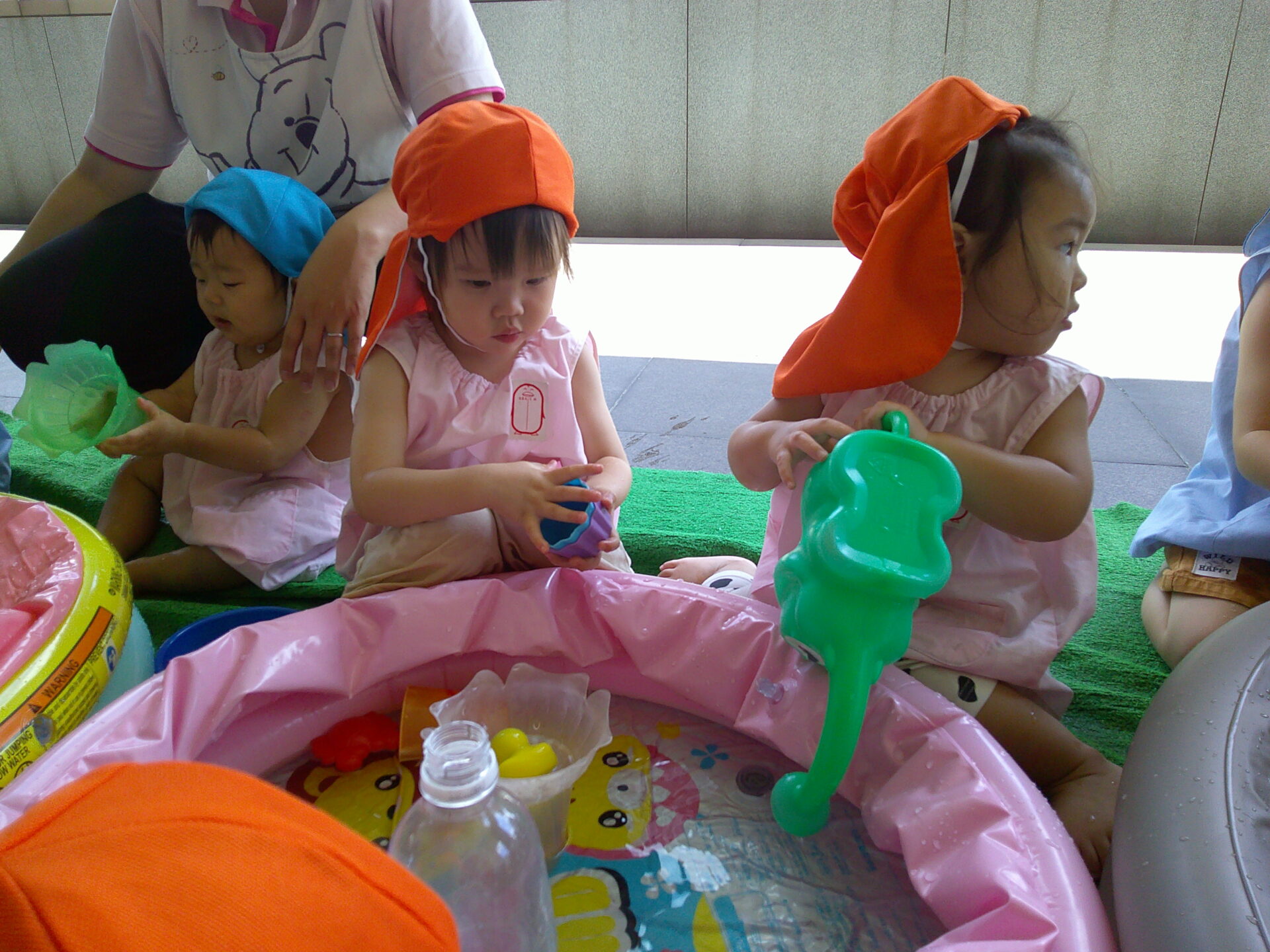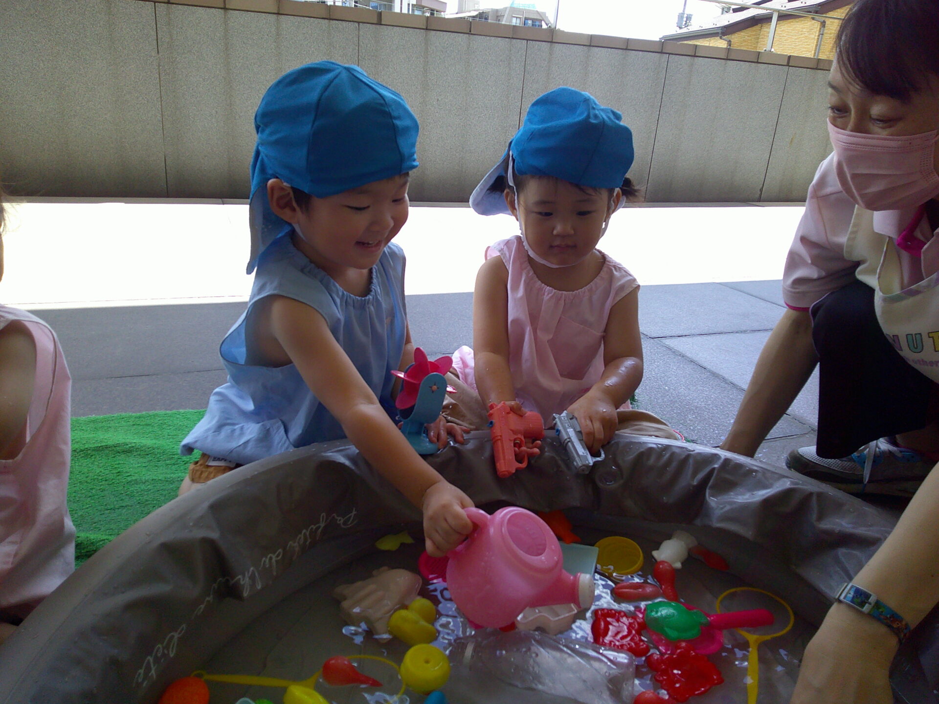 みんな、水遊びは大好きなので、ジョーロやバケツなどにお魚やアヒルの玩具を入れて遊んだり、水鉄砲で先生とかけ合って楽しんでいました😄
