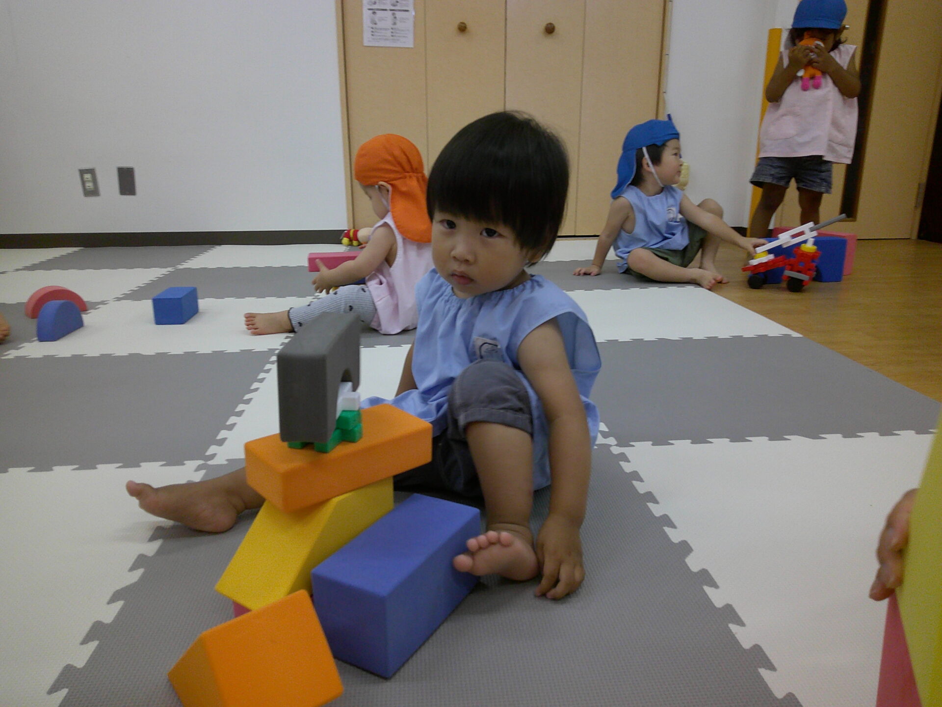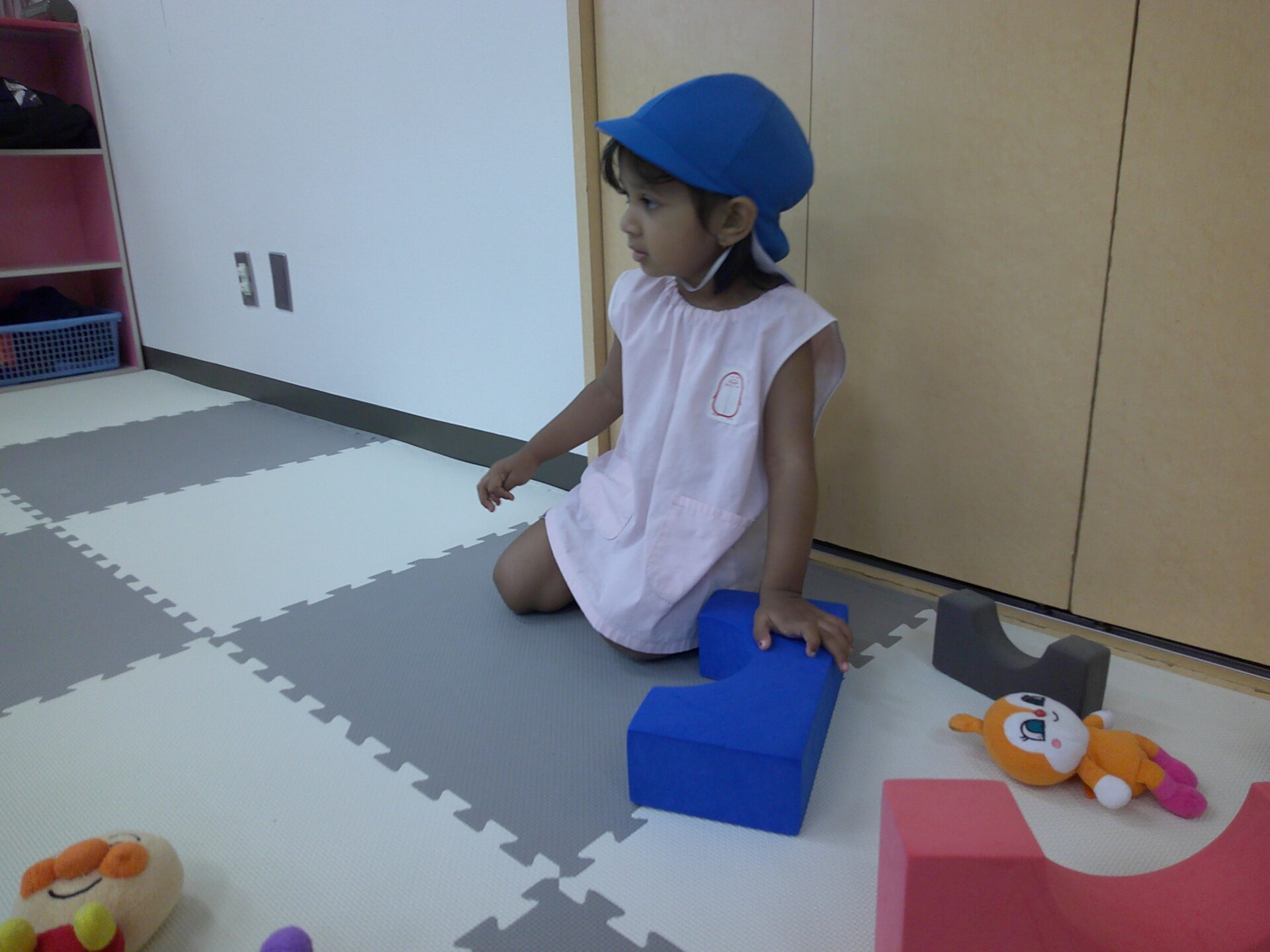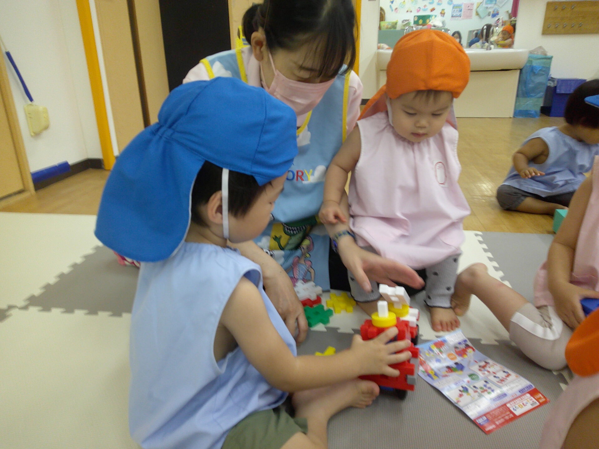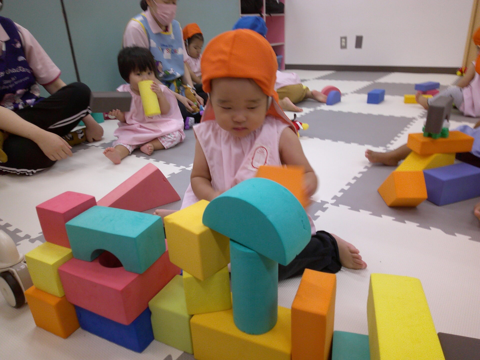 お水遊びの前にソフトブロックやニューブロックで遊びましたよ😊新しいブロックに興味津々な様子でした。ちょっぴり難しかったので、こあら組さんが保育者と一緒に作ったのがこちら✨