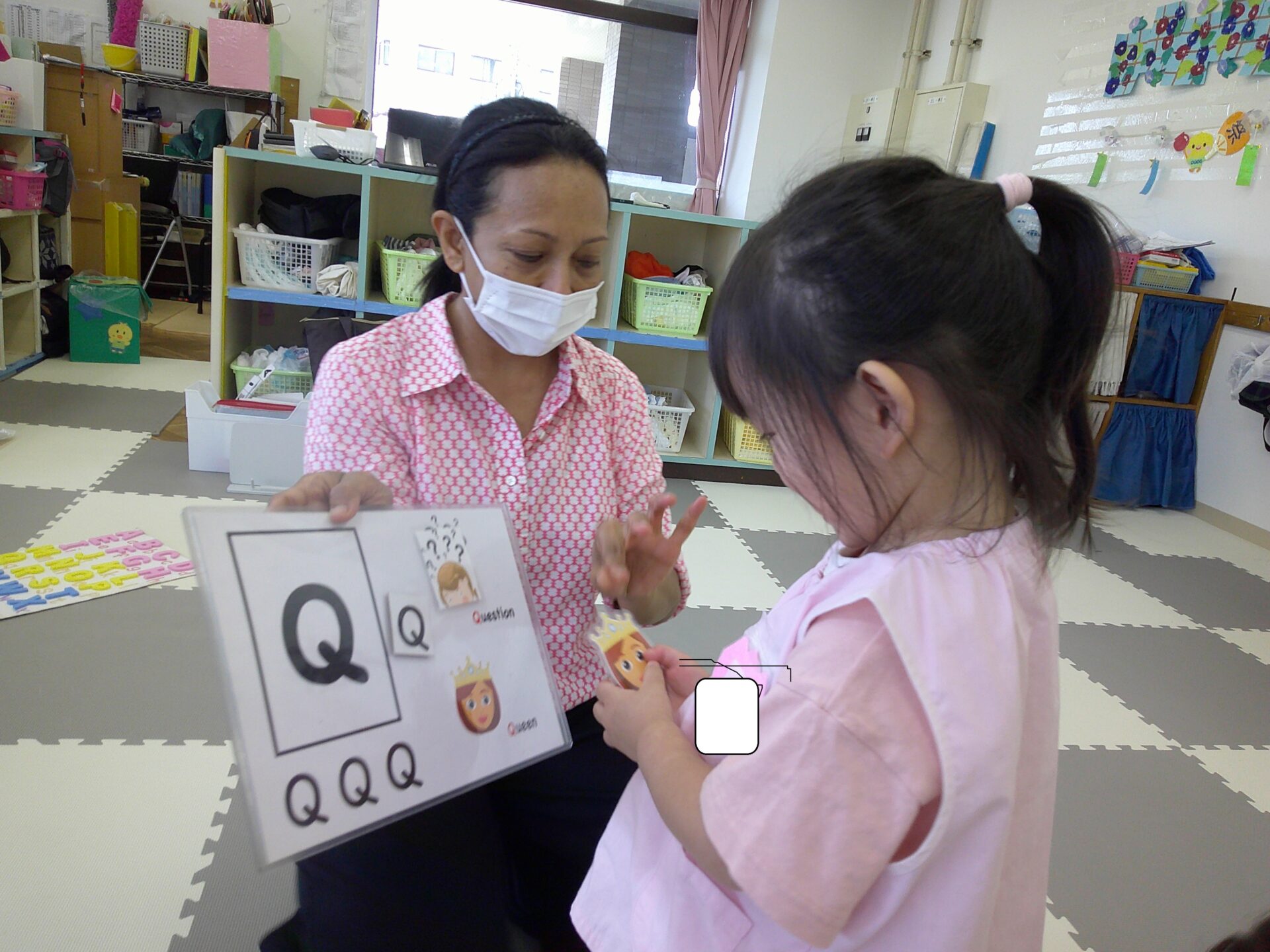 今日はお天気やopen close、fast slow、フルーツ、【Q】をお勉強しました。お家でお話を聞いてみて下さいね。