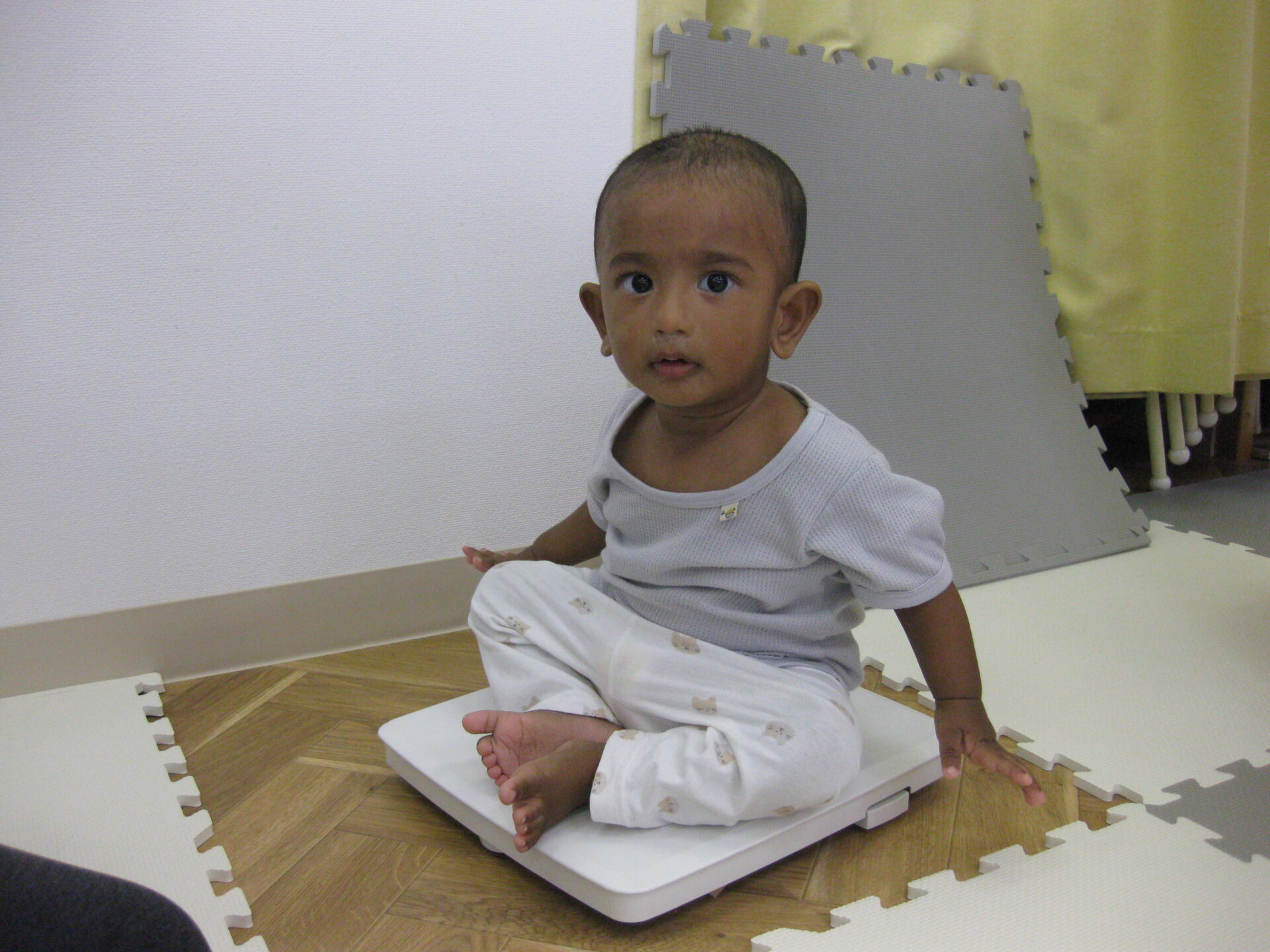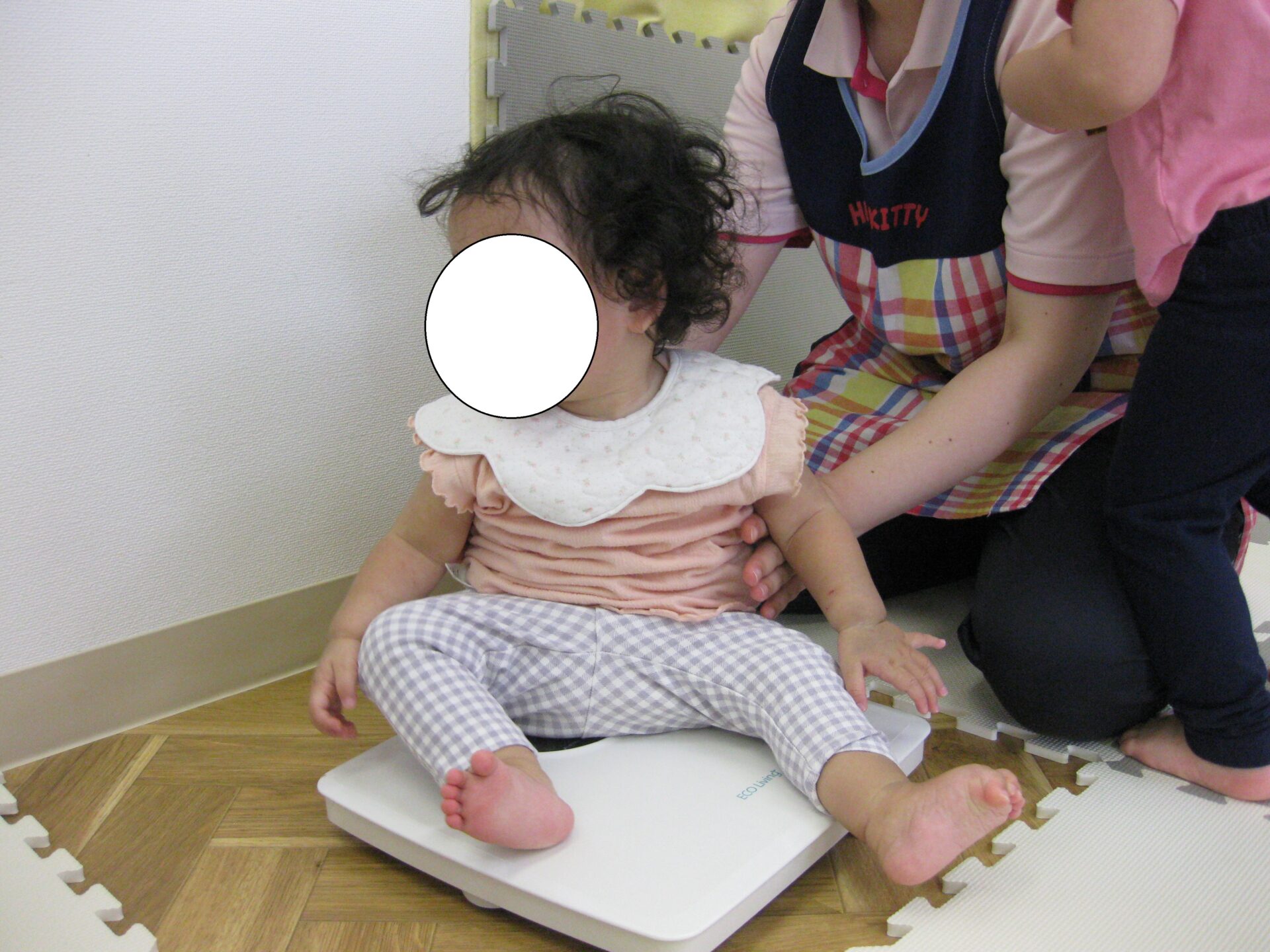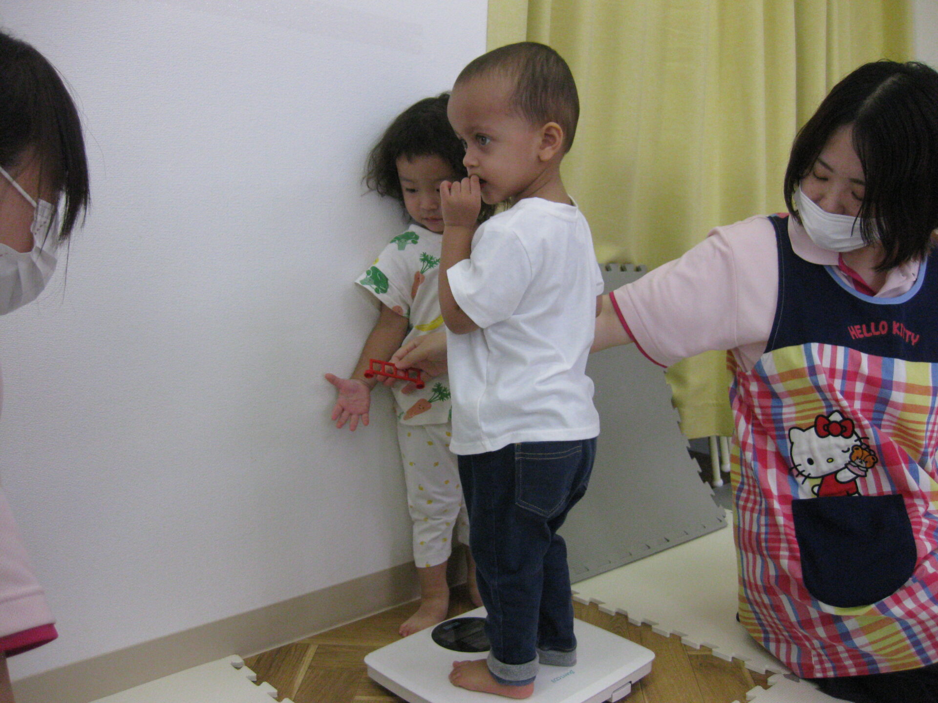 体重計に乗って、上手に測ることが出来ました。測定を近くで見ているお友だちもいましたよ。
