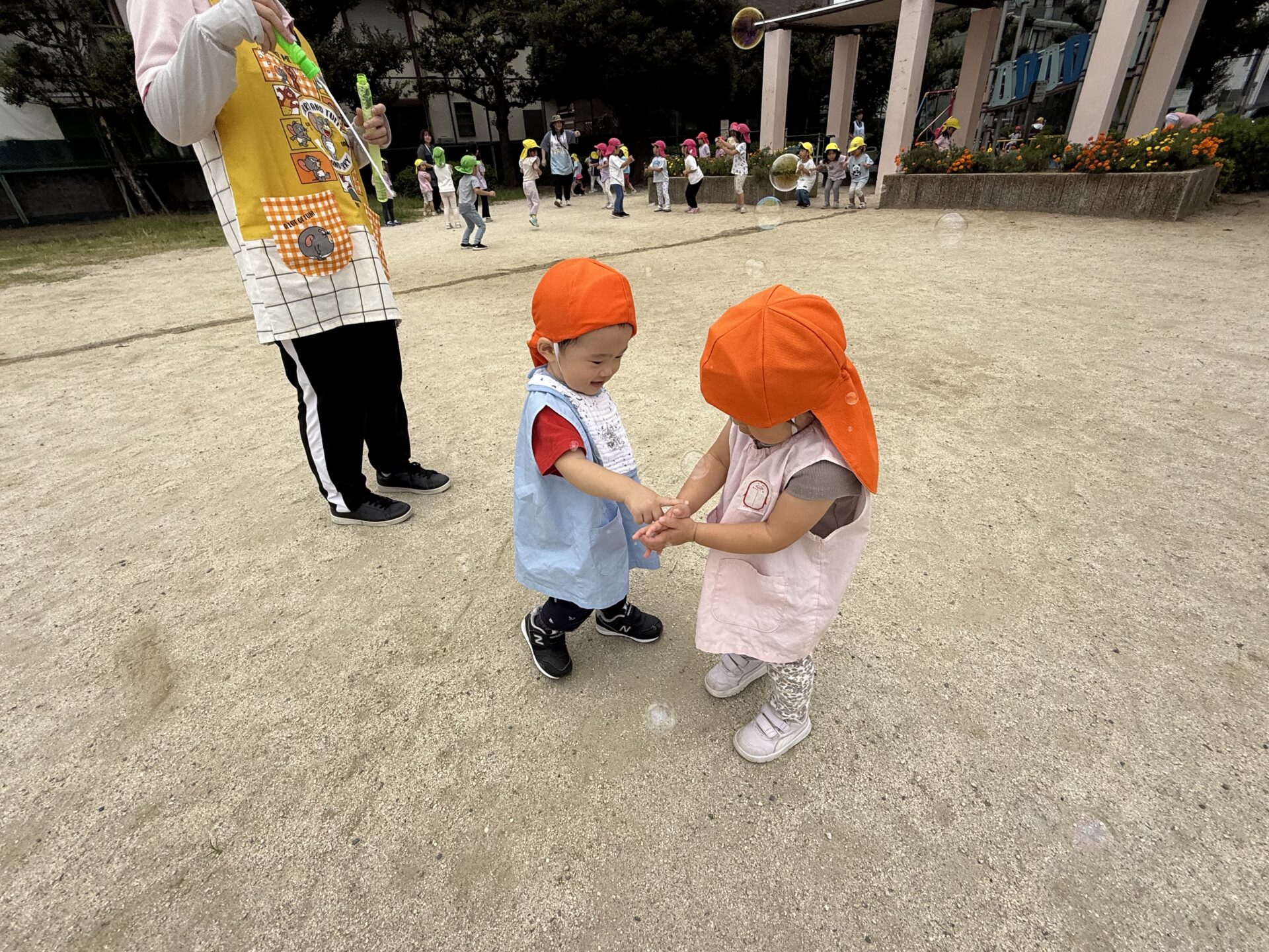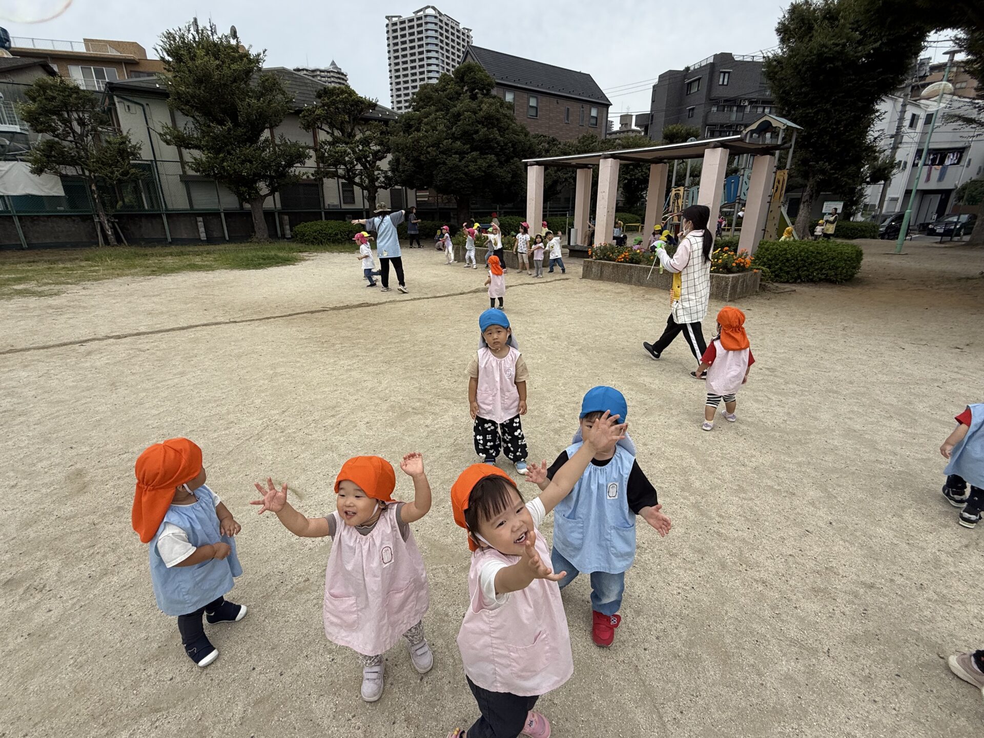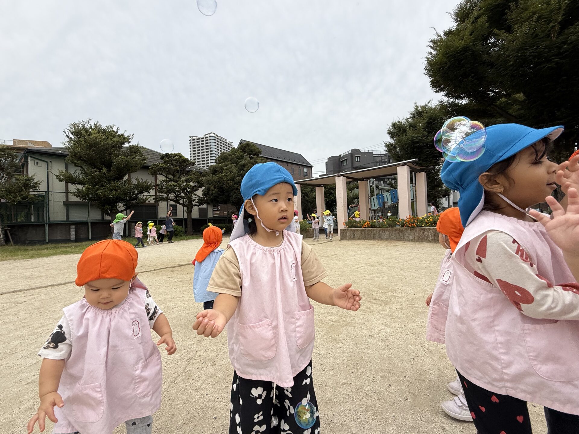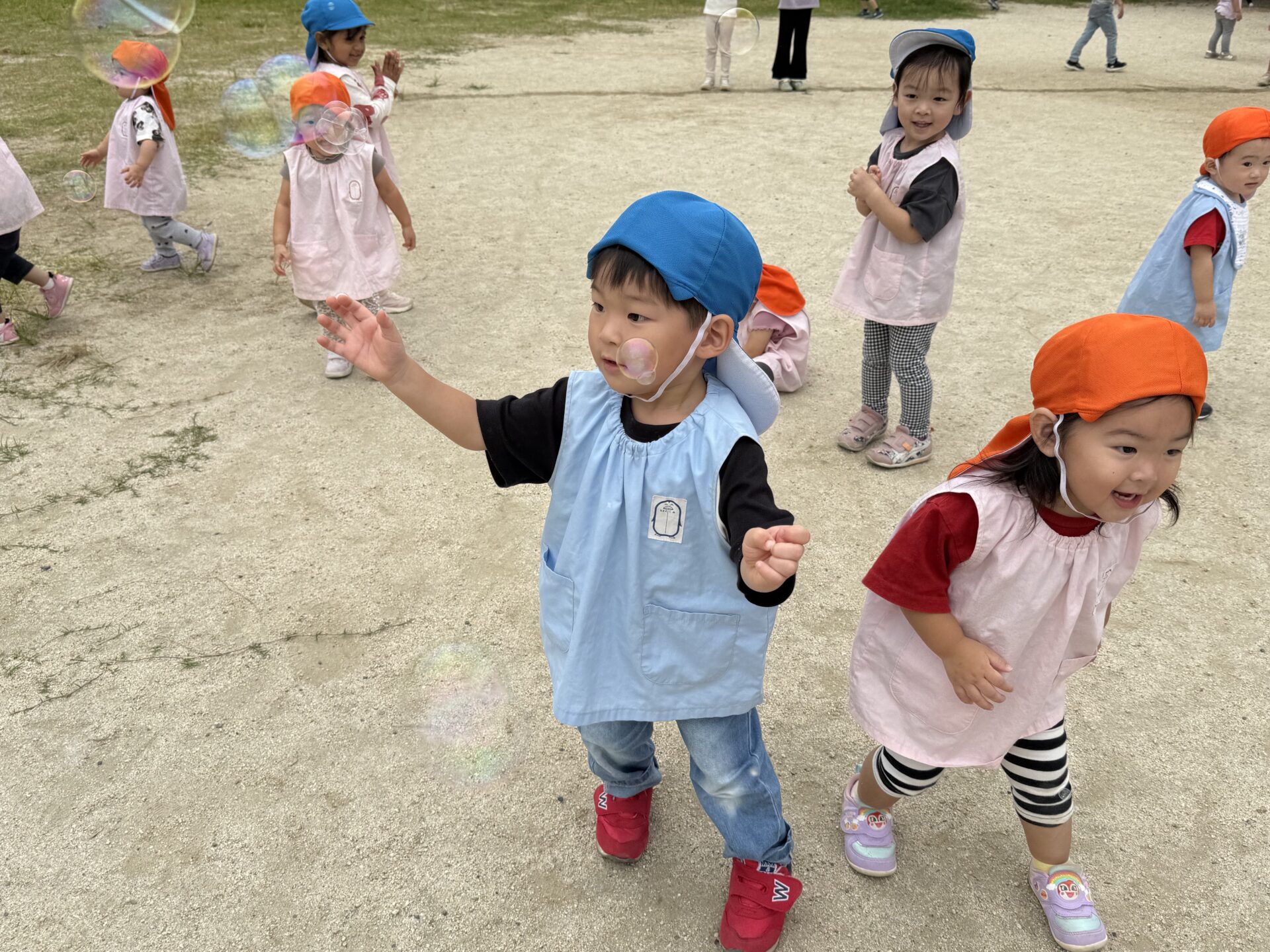 永瀬公園では、広場でかっけこをしたり、砂遊びをしたり、先生がシャボン玉を始めると風で飛んでいく方向に走って行っては、みんなで「パチン!」とやって捕まえようとして楽しんでいました🤗