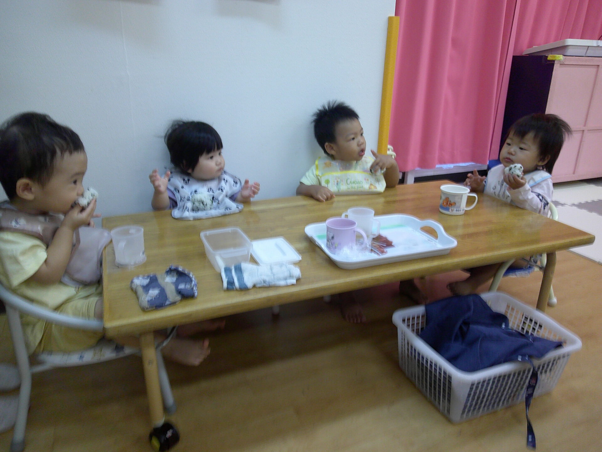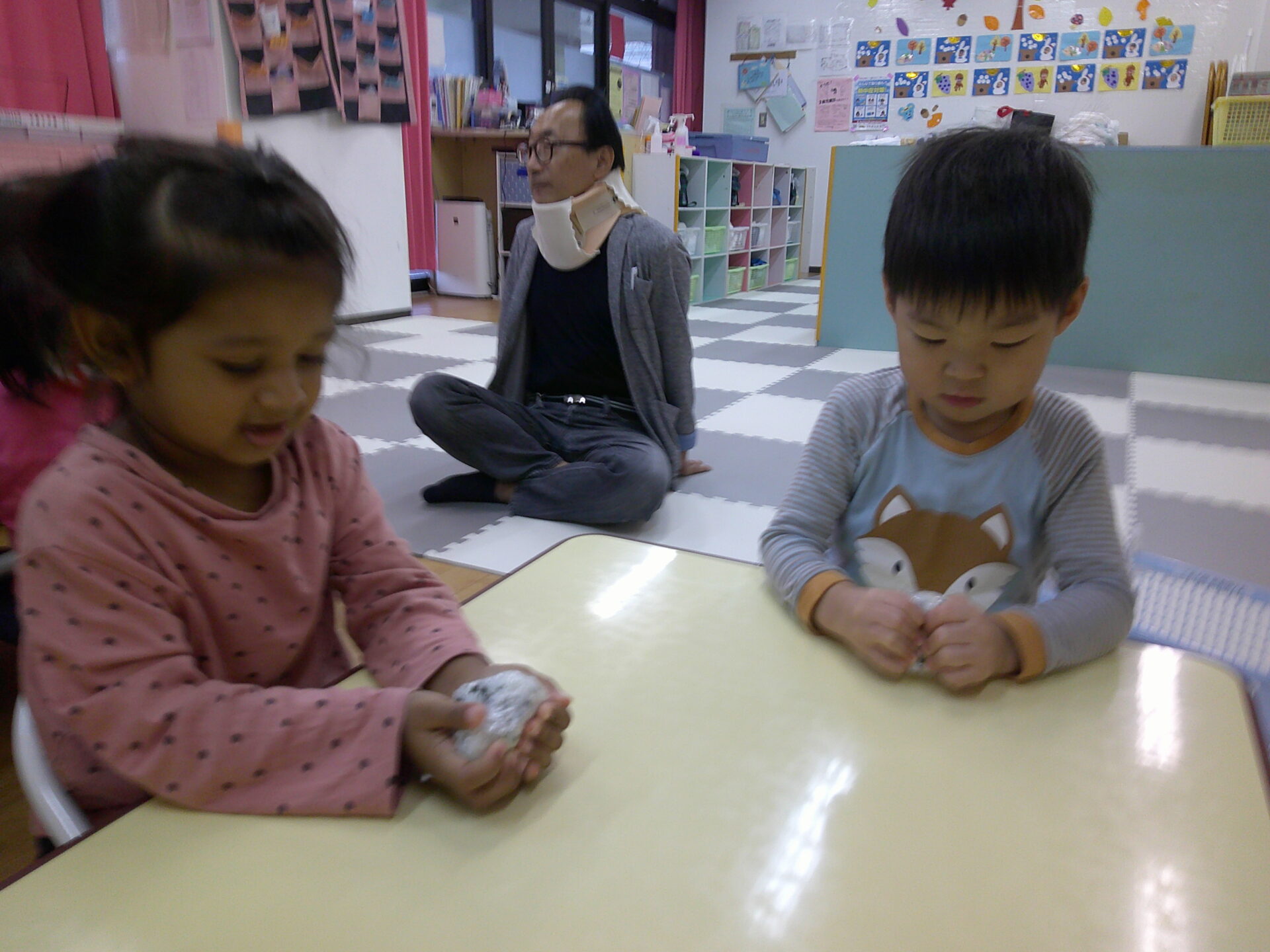 おやつの時間にみんなでおにぎり作りにチャレンジしましたよ🍙その様子を少し載せたいと思います📸✨最初に炊く前のお米をみんなで見て触ってみました。これがご飯になるよ、とお話すると不思議そうでしたよ。次はラップに包んであるわかめご飯をにぎにぎ🍙三角は難しかったですが、それぞれ一生懸命握ってくれました。いつもよりおいしかったかな??おうちでもお話を聞いてみてくださいね✨