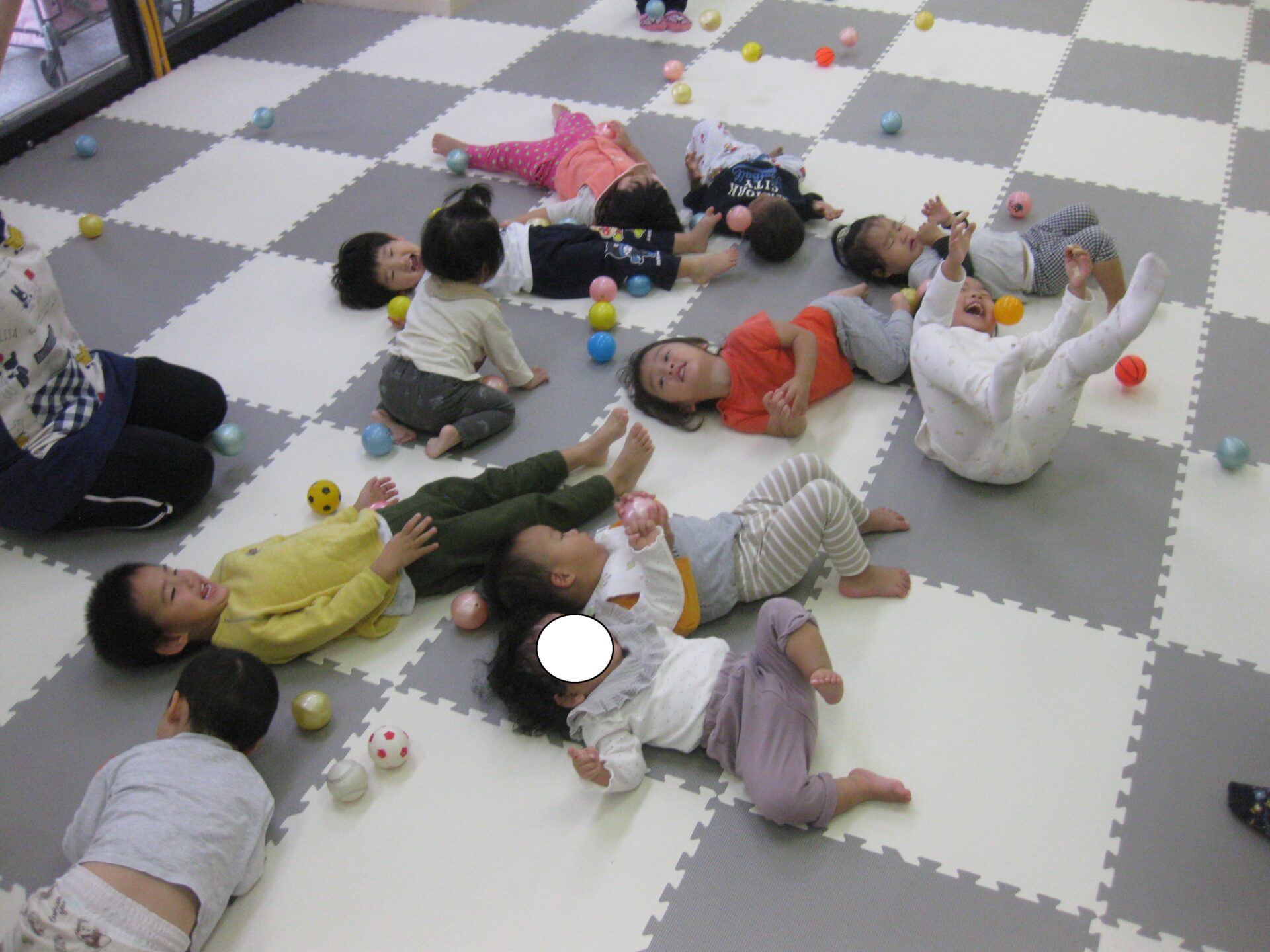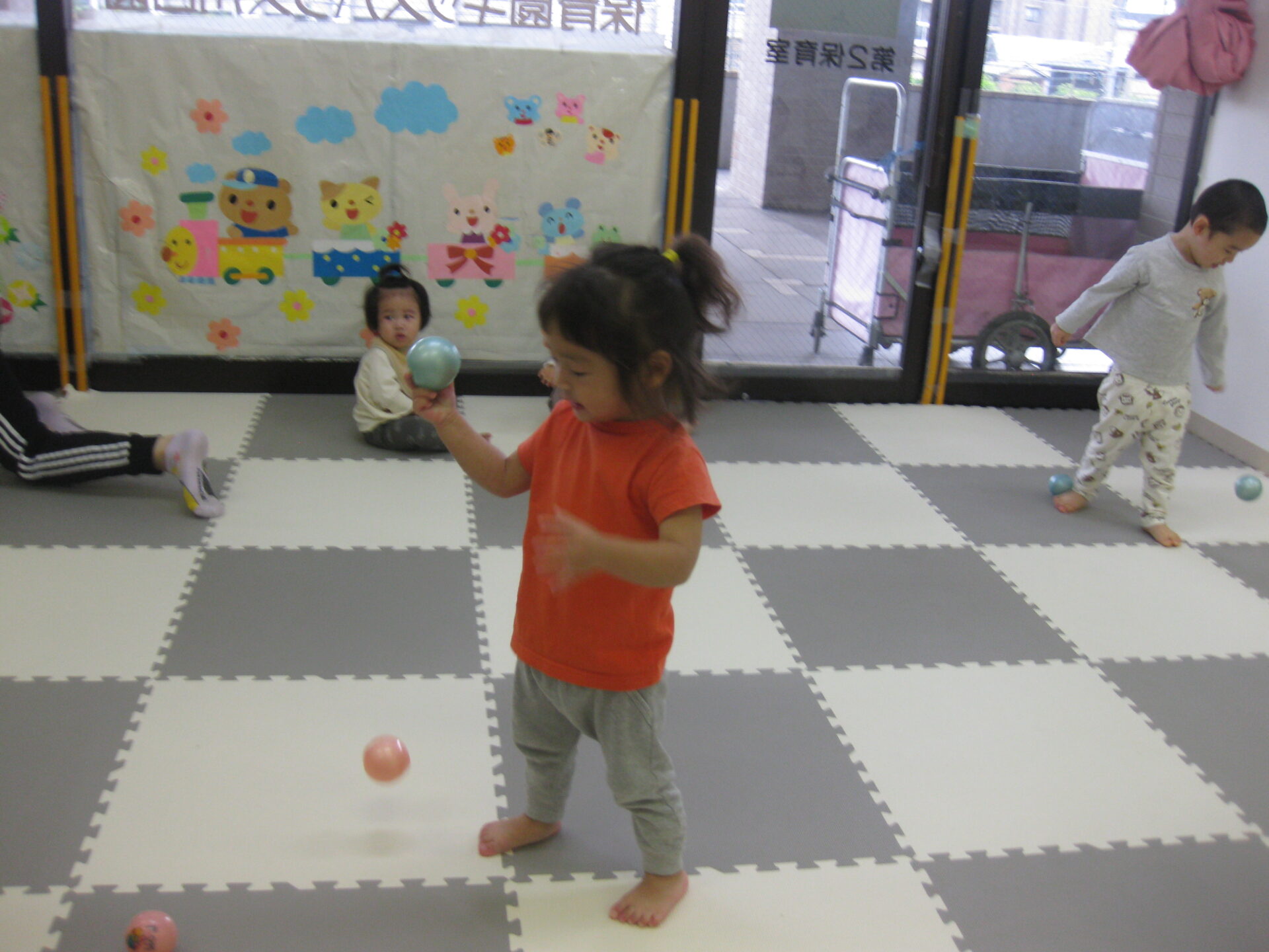ボールの感触を楽しんでいるお友だち・先生とボールの投げ合いを楽しむお友達と様々でした😆