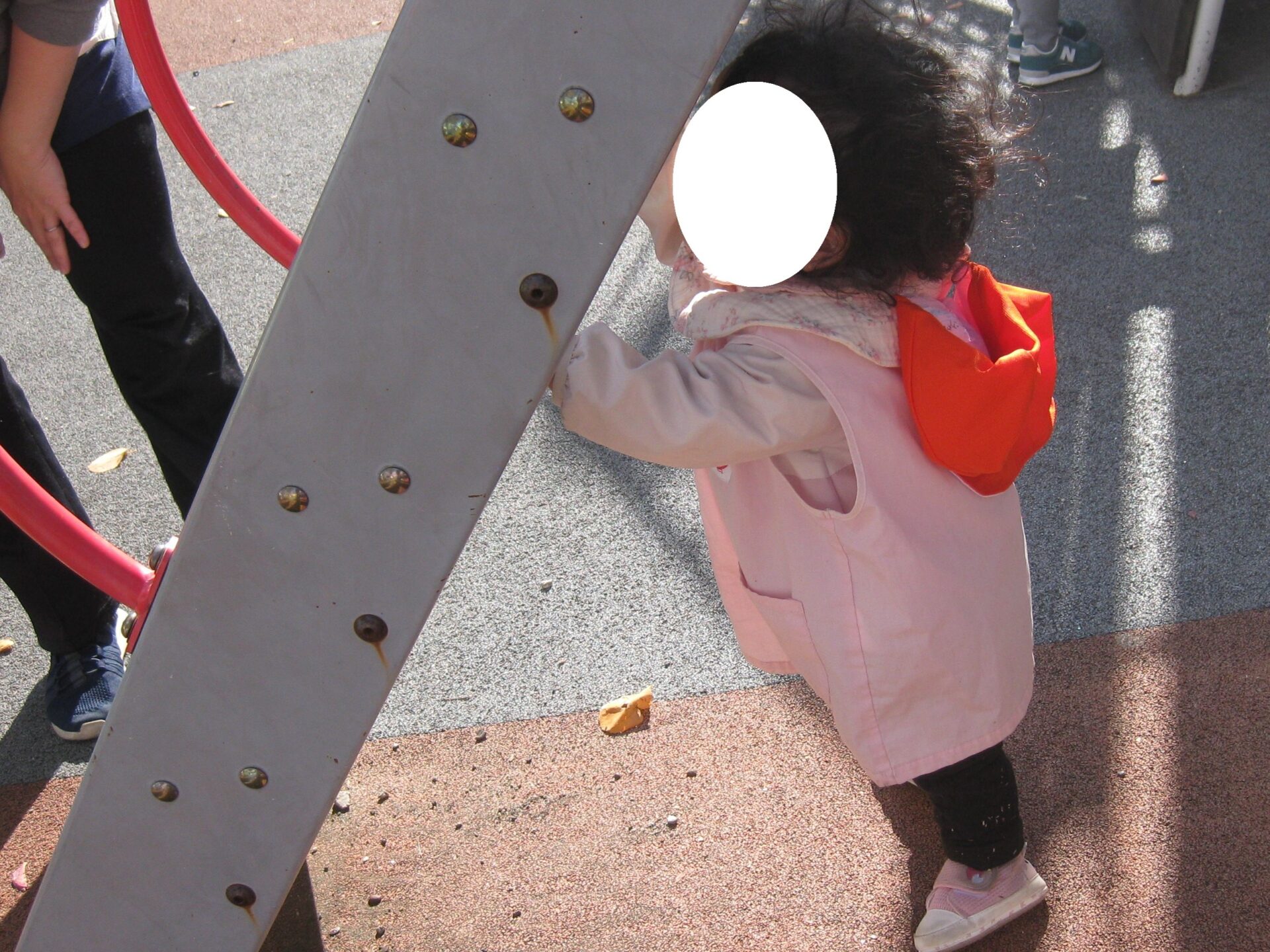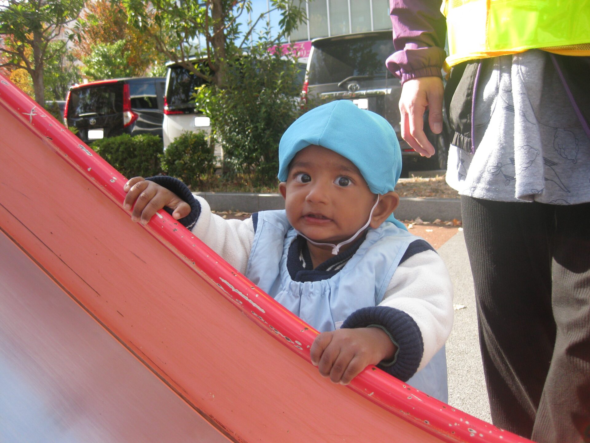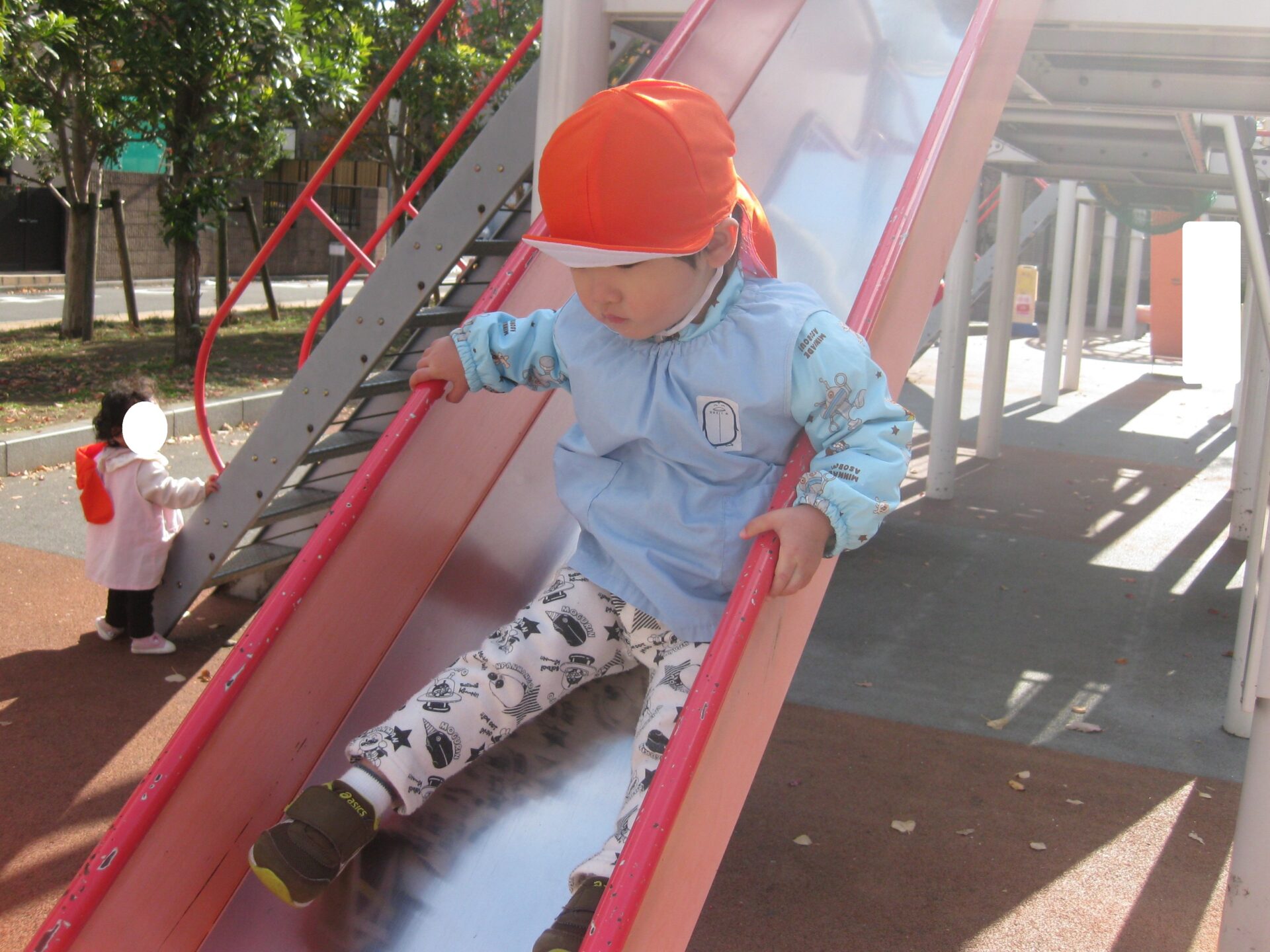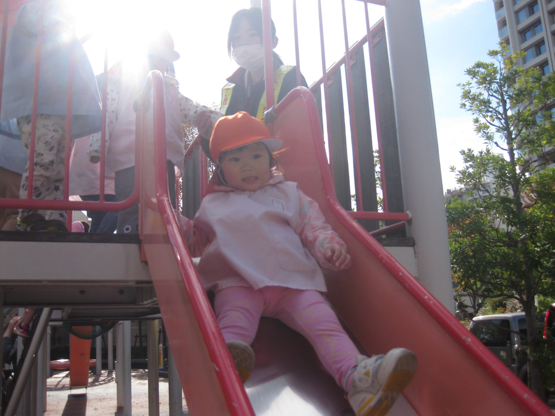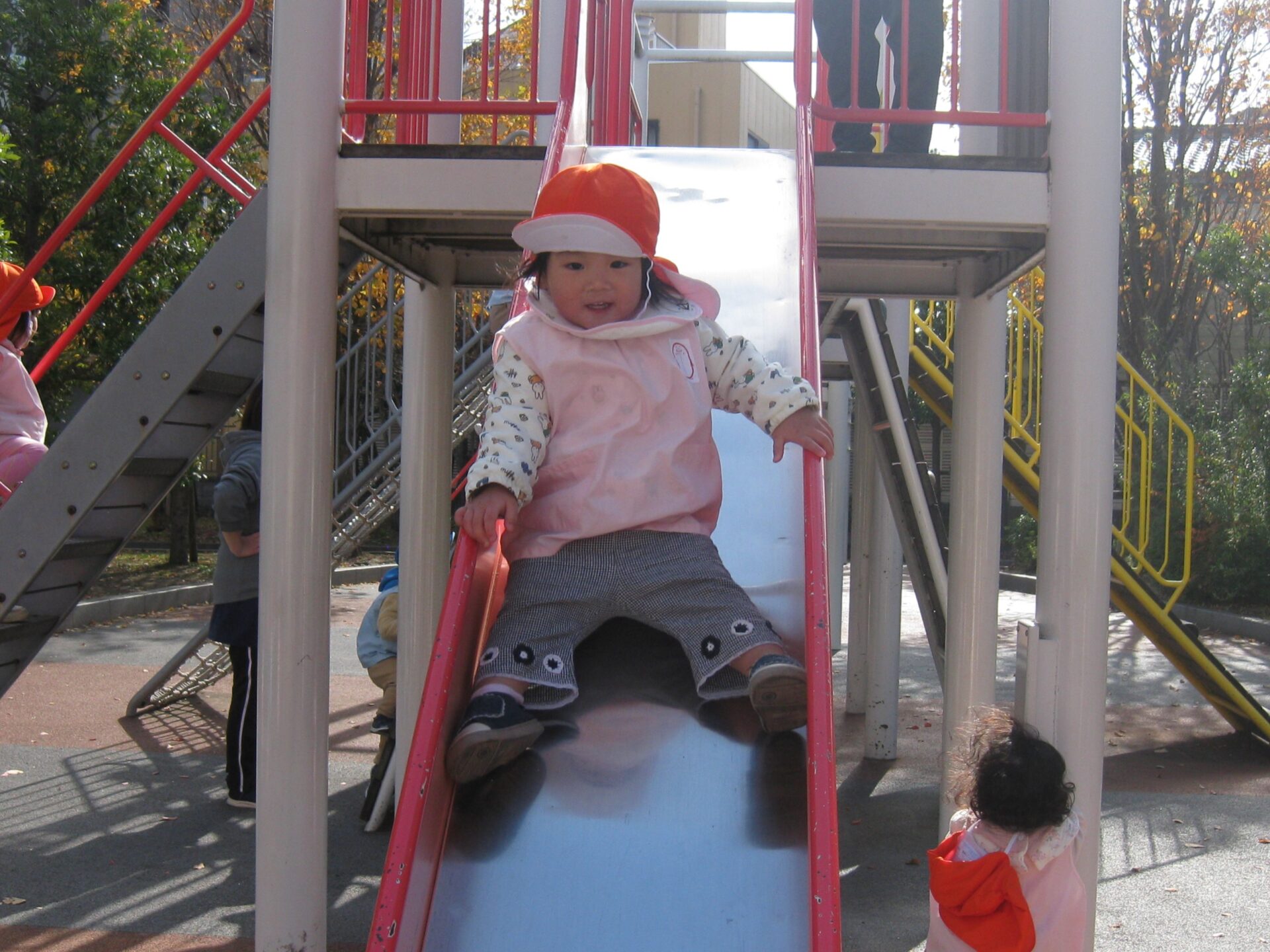 滑ってくるお友達を待ち構えているひよこ組のお友達🐤