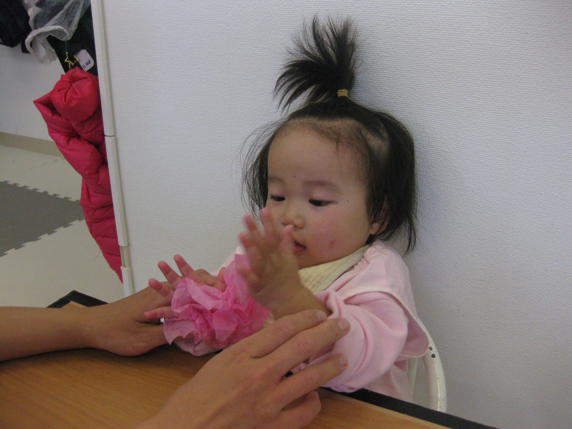 ひよこ組さんは袋にシール貼りをしたり、花紙を丸めて袋に入れていましたよ。