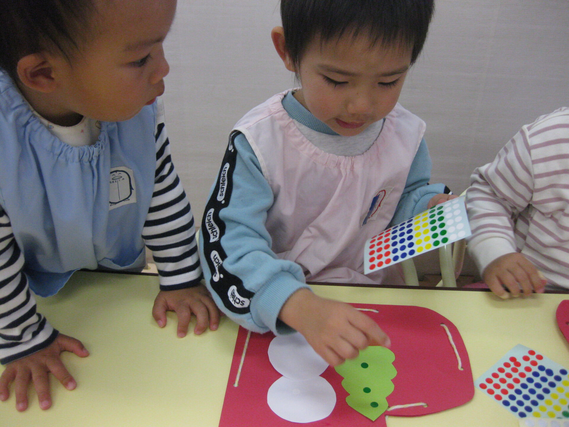 こあら組さんはクリスマスブーツにツリーと雪だるまを貼り、丸シールでツリーを飾りつけしました✨