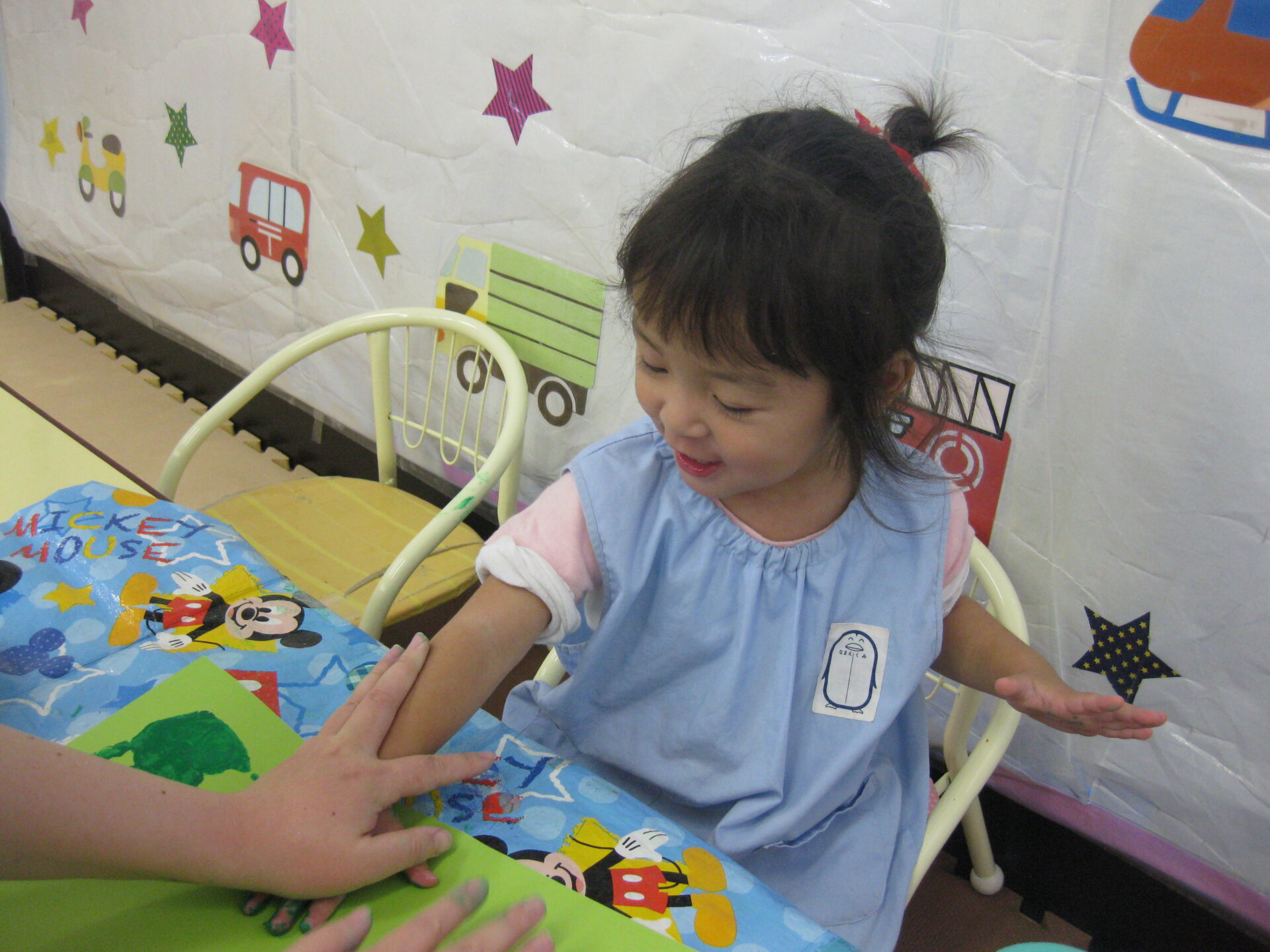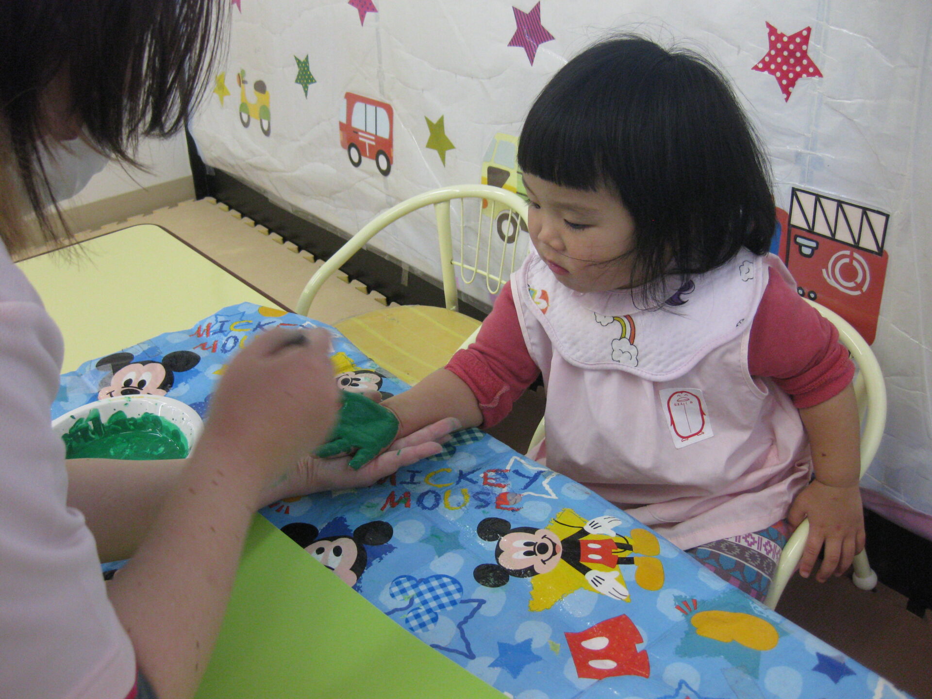 緑の絵の具で取った手形は何になるのか楽しみですね♬