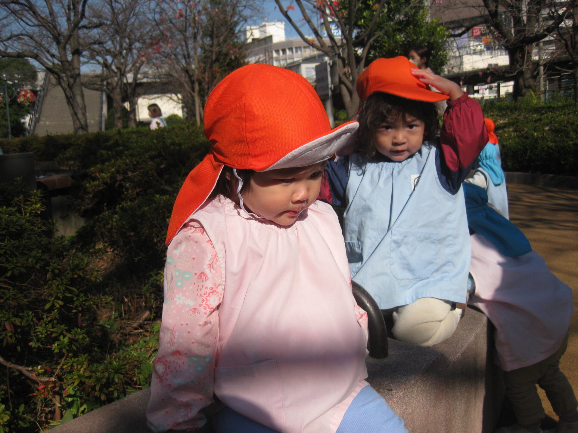 「バス見れるかな?」「ゴミ収集車も見れるかも!」とお話を楽しみながら広場まで歩きましたよ。