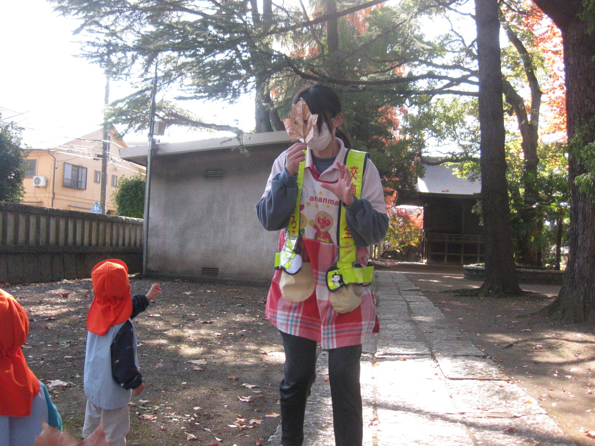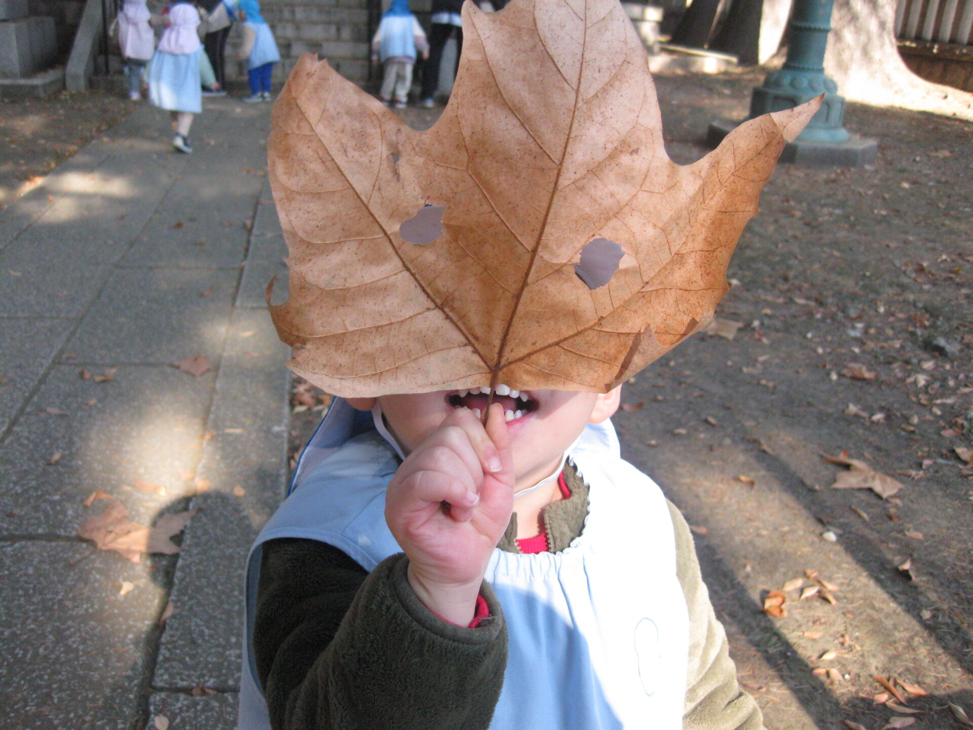 先生が枯れ葉をお面にして子ども達を驚かせていました👻