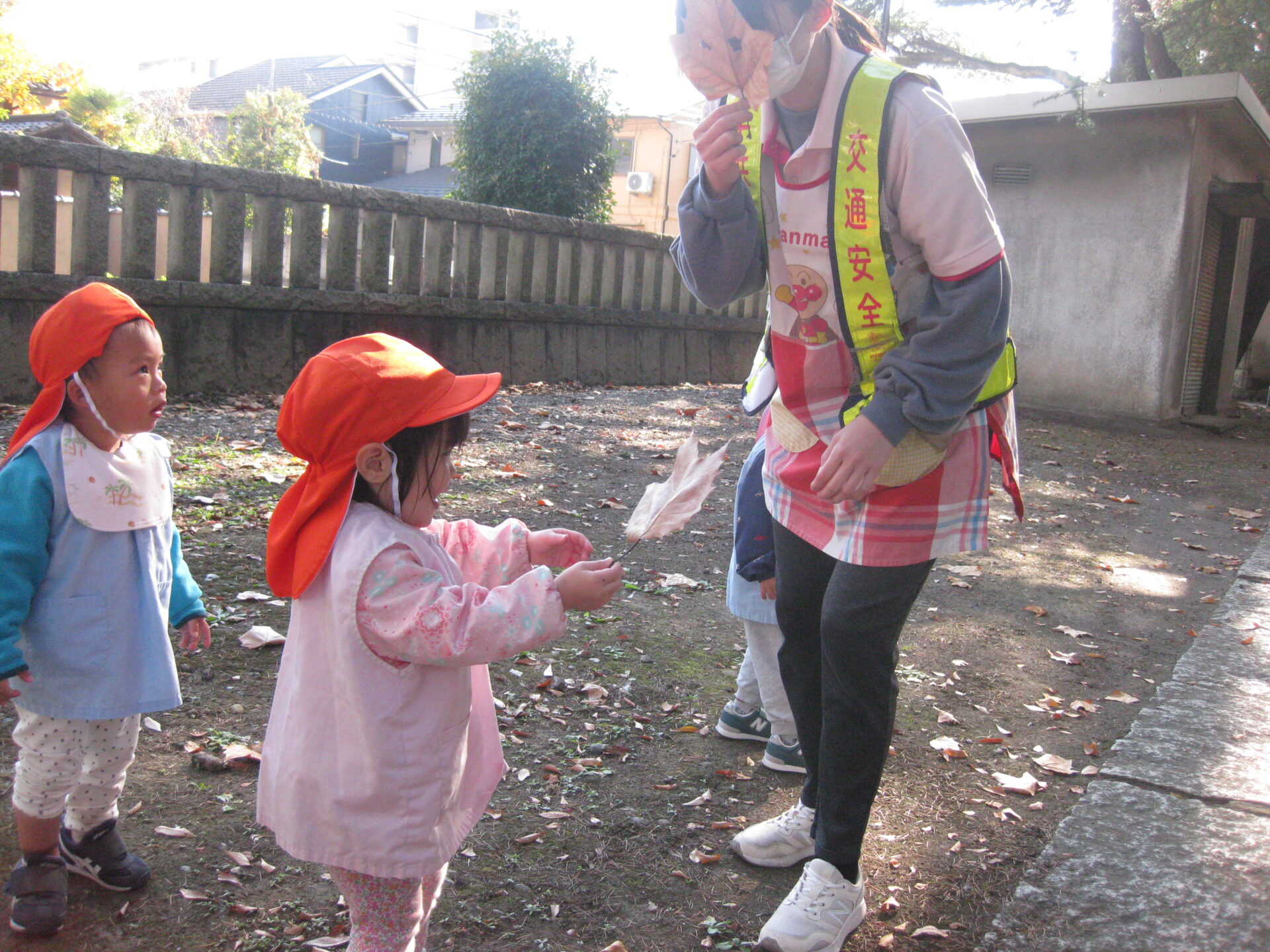 第一保育室のお友だちと一緒に落ち葉を拾ったり、お花を見つけたりして遊びました🍂