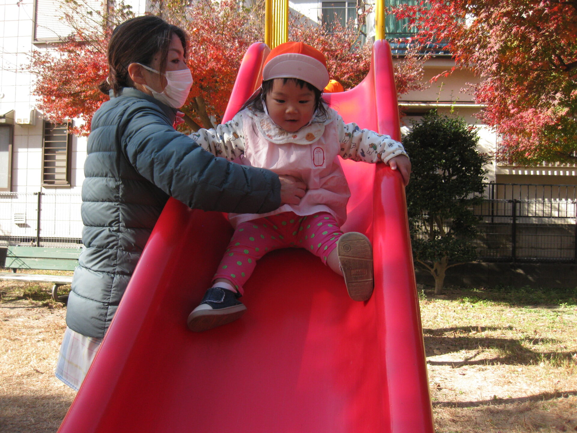 ぴよぴよ公園の滑り台は速さが出るのでうさぎ組さんは先生の手を借りて滑りました🤗