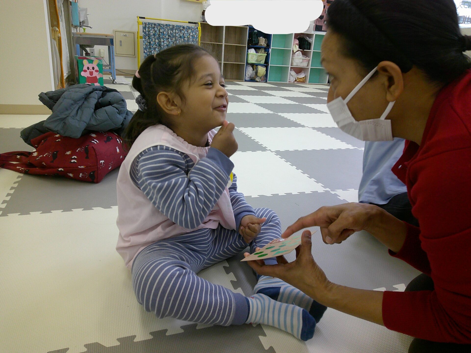 サンタさんからツリーまでの道のりにある1~10までの数字に、先生が英語で伝えた数字のシールを探して貼りました✨道は完成したかな??