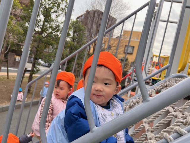 うさぎ組さんはあみあみ登りにも挑戦!上まで登ってゆらゆら橋を渡って、滑り台を滑ります。一生懸命手足を動かして登る姿はカッコイイですね✨