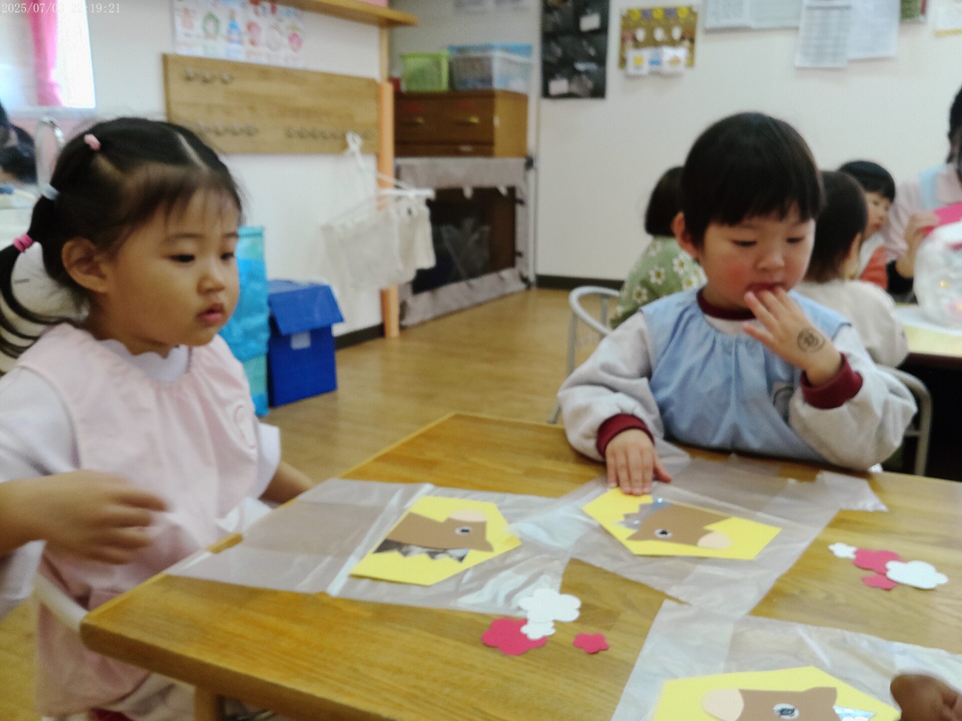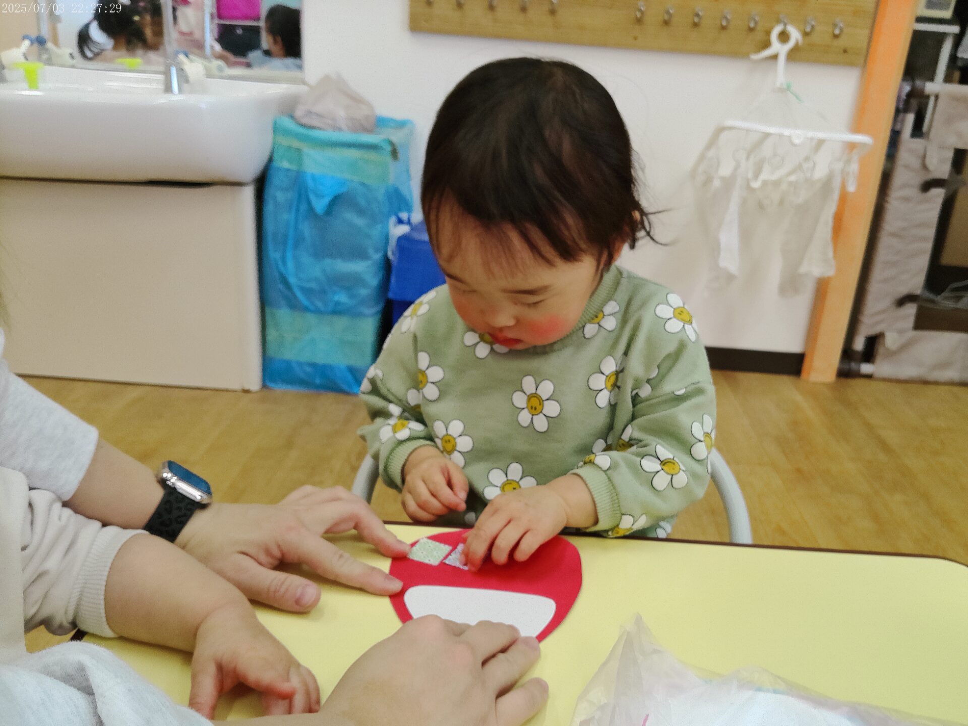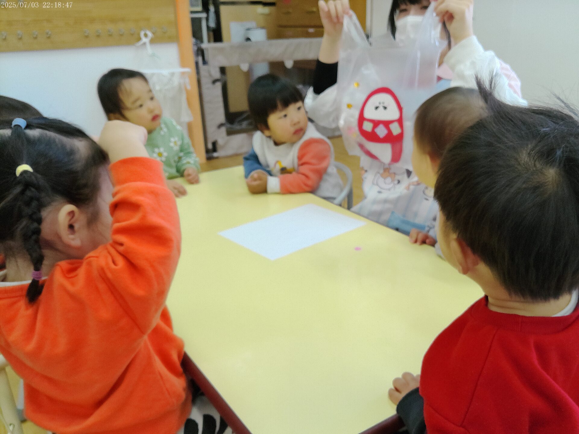 この後、だるまさんの体に飾りの折り紙を貼ると、「かわいー!」と、とっても喜んでいました!😊