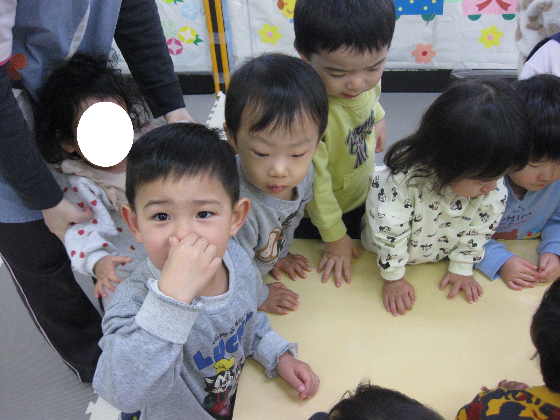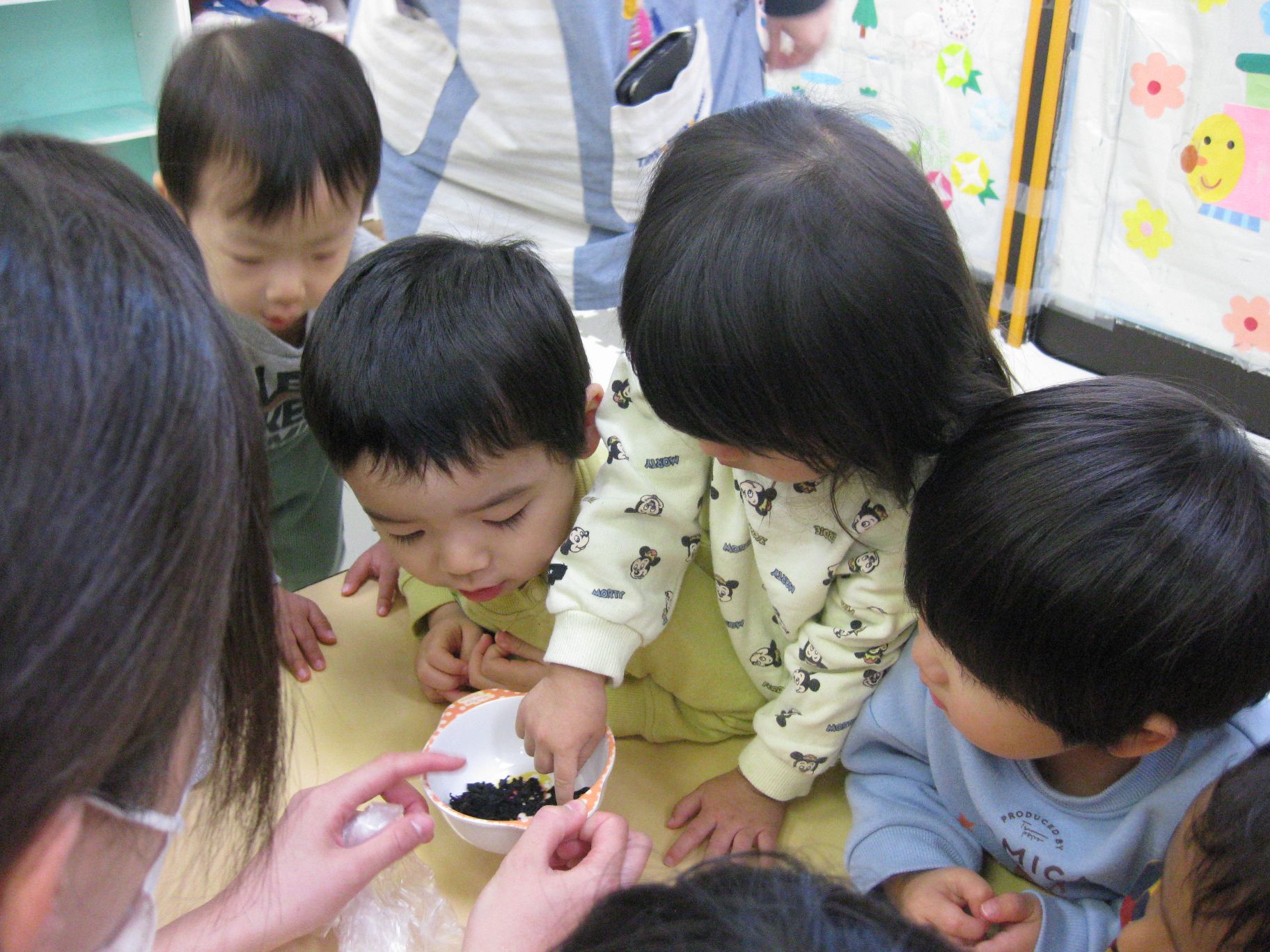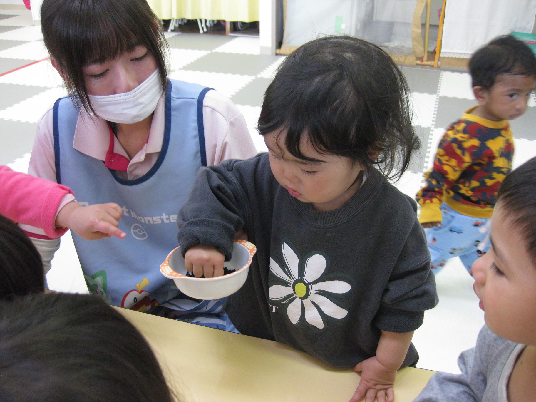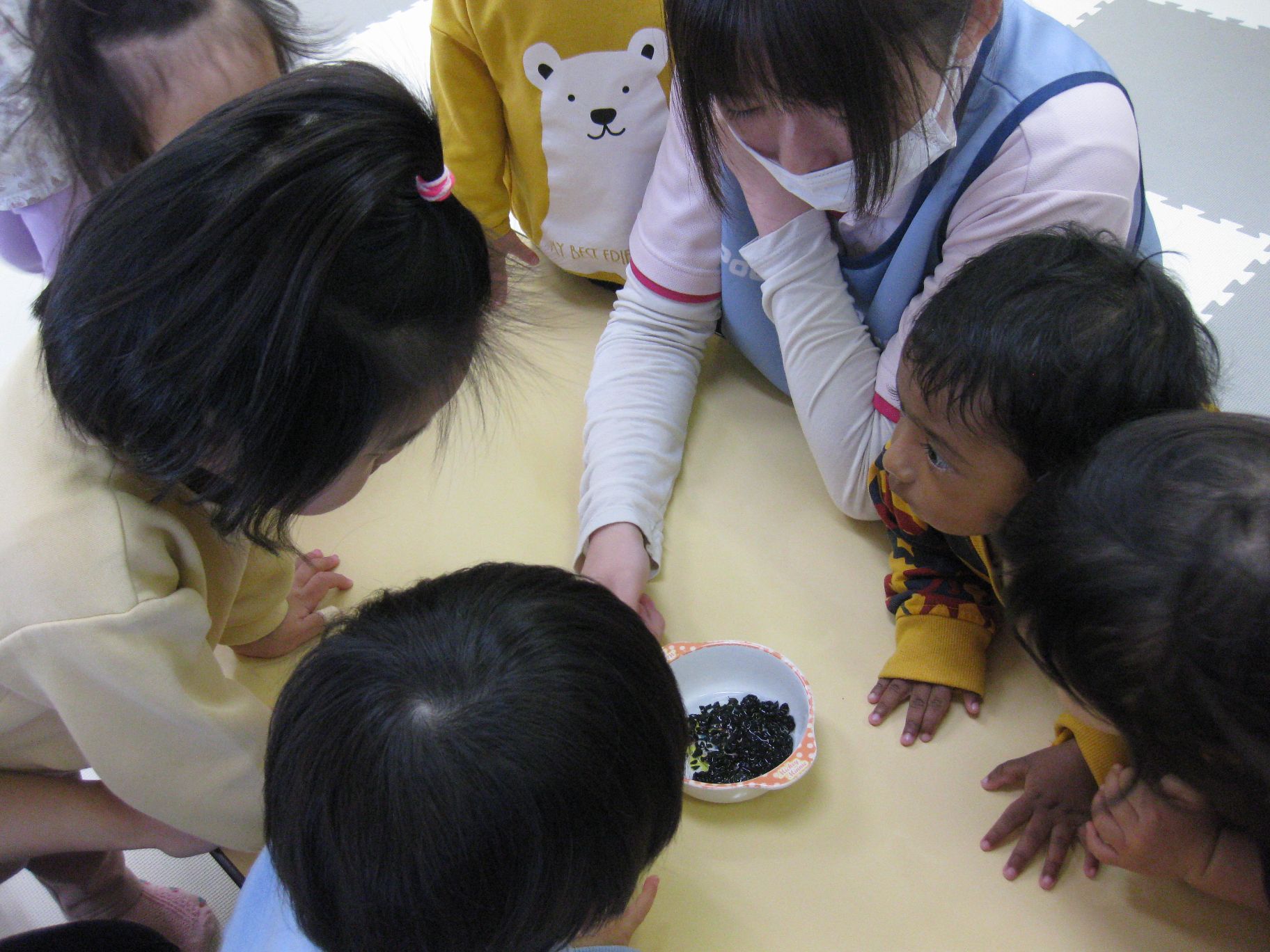 黒いつぶつぶはなんだろう?と覗き込むお友達( *´艸`)