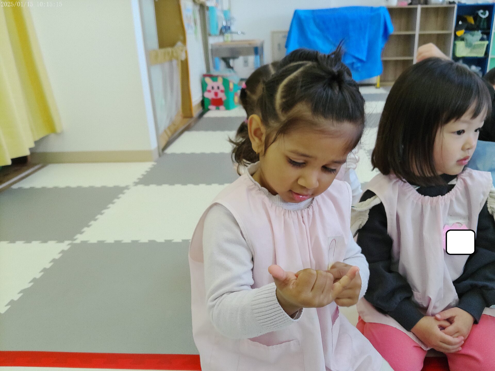 sunday monday…と曜日のお歌があって、最後にこの↓手のポーズをするんです。その準備を一生懸命やってます😊