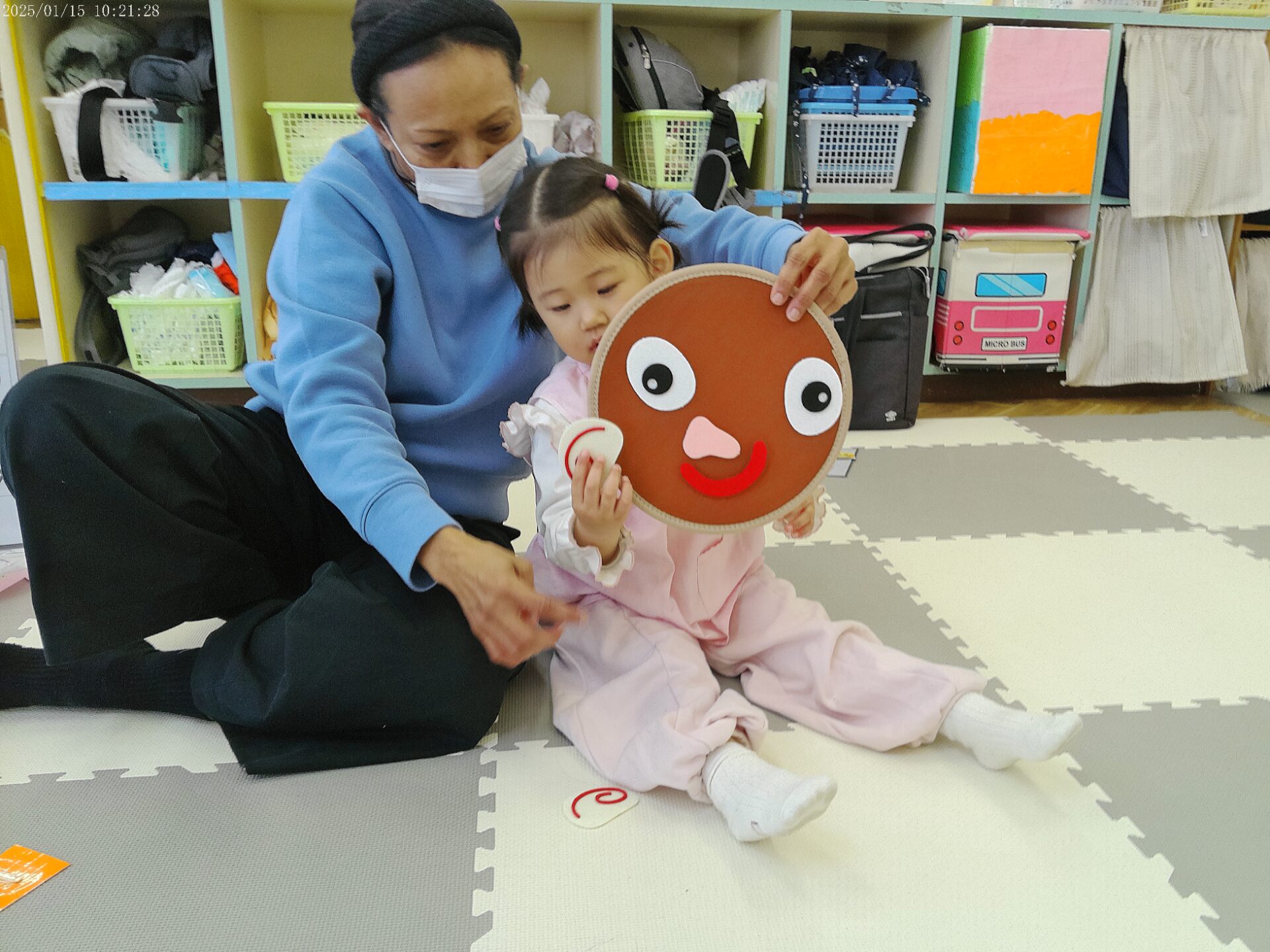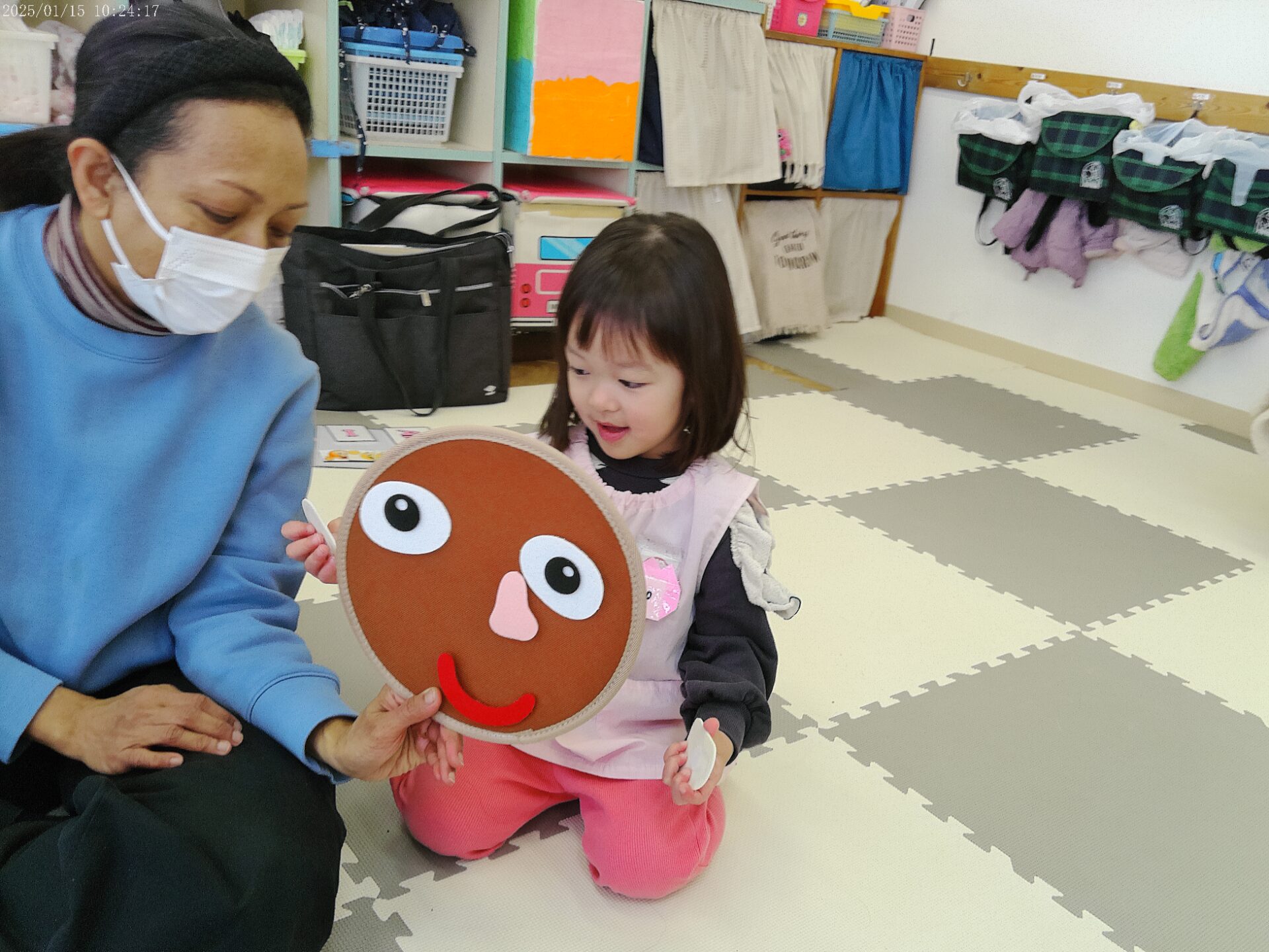 お顔のパーツを教えてもらって、福笑い