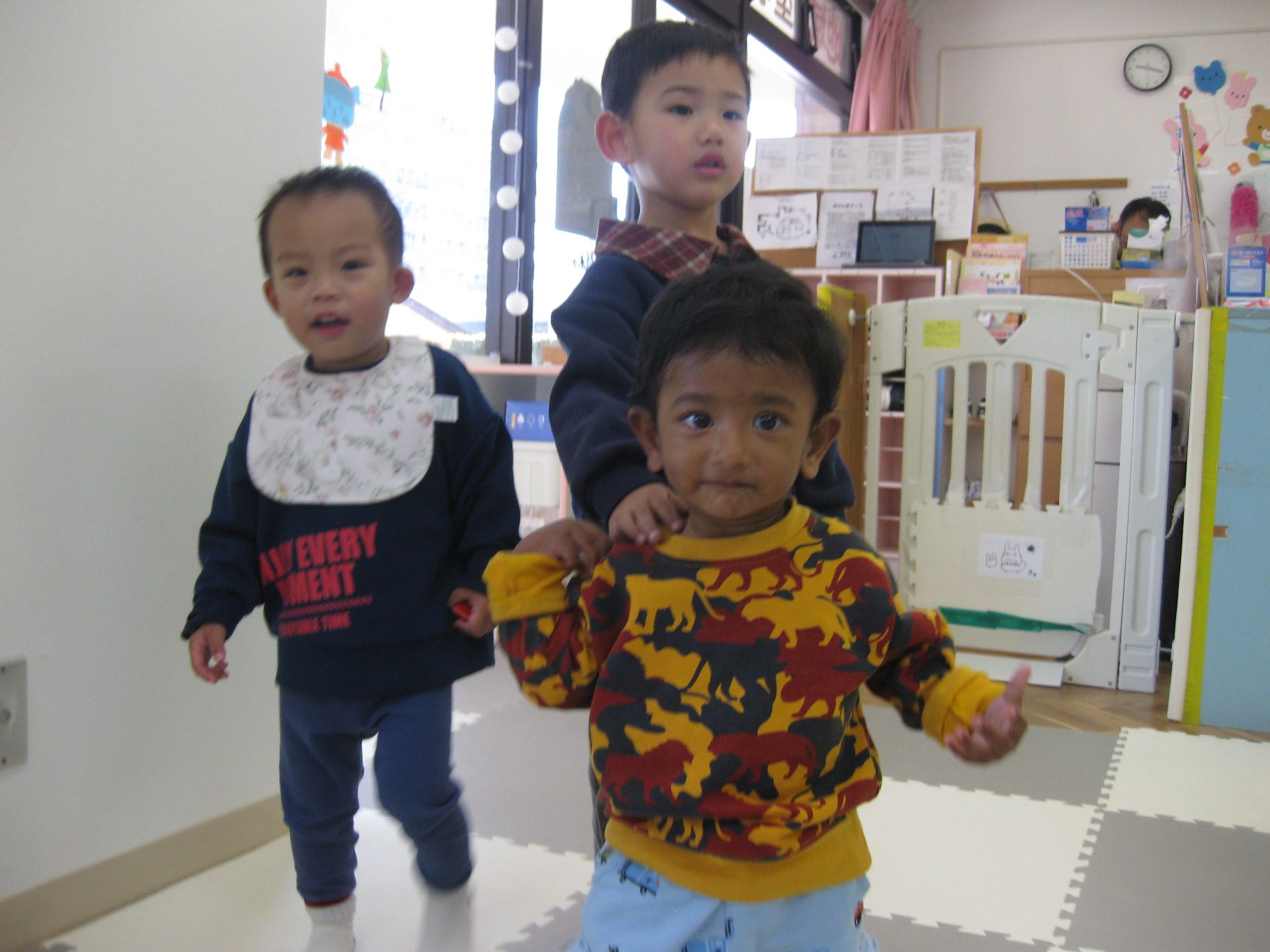 北風が吹く中でしたが、日の当たる暖かいところで、たくさん歩いて園内の散策をしたり、かけっこなどを楽しみながら、身体を温めました😊!