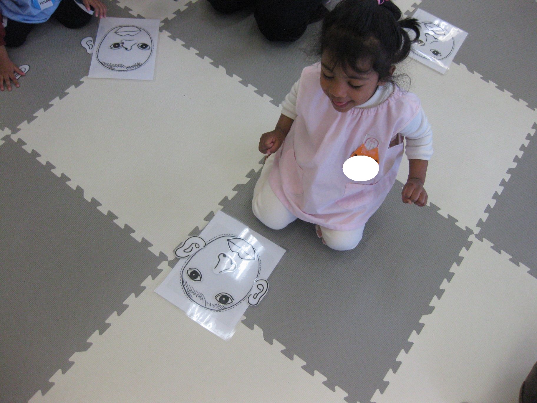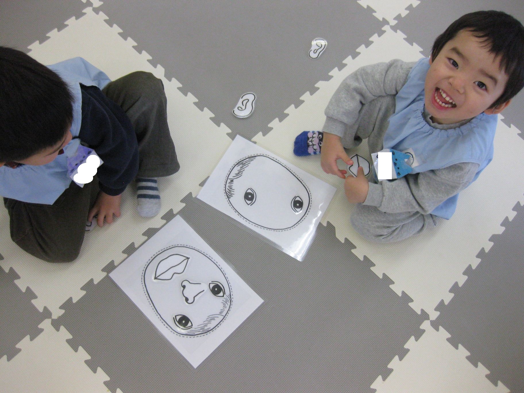 「eyes!」「nose!」と、先生が指示するパーツをしっかりと聞いて、顔に貼りました。どんなお顔が出来上がったのかな…?
