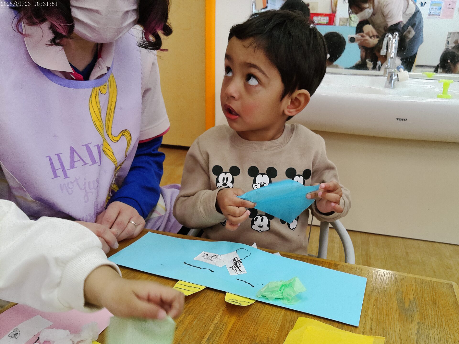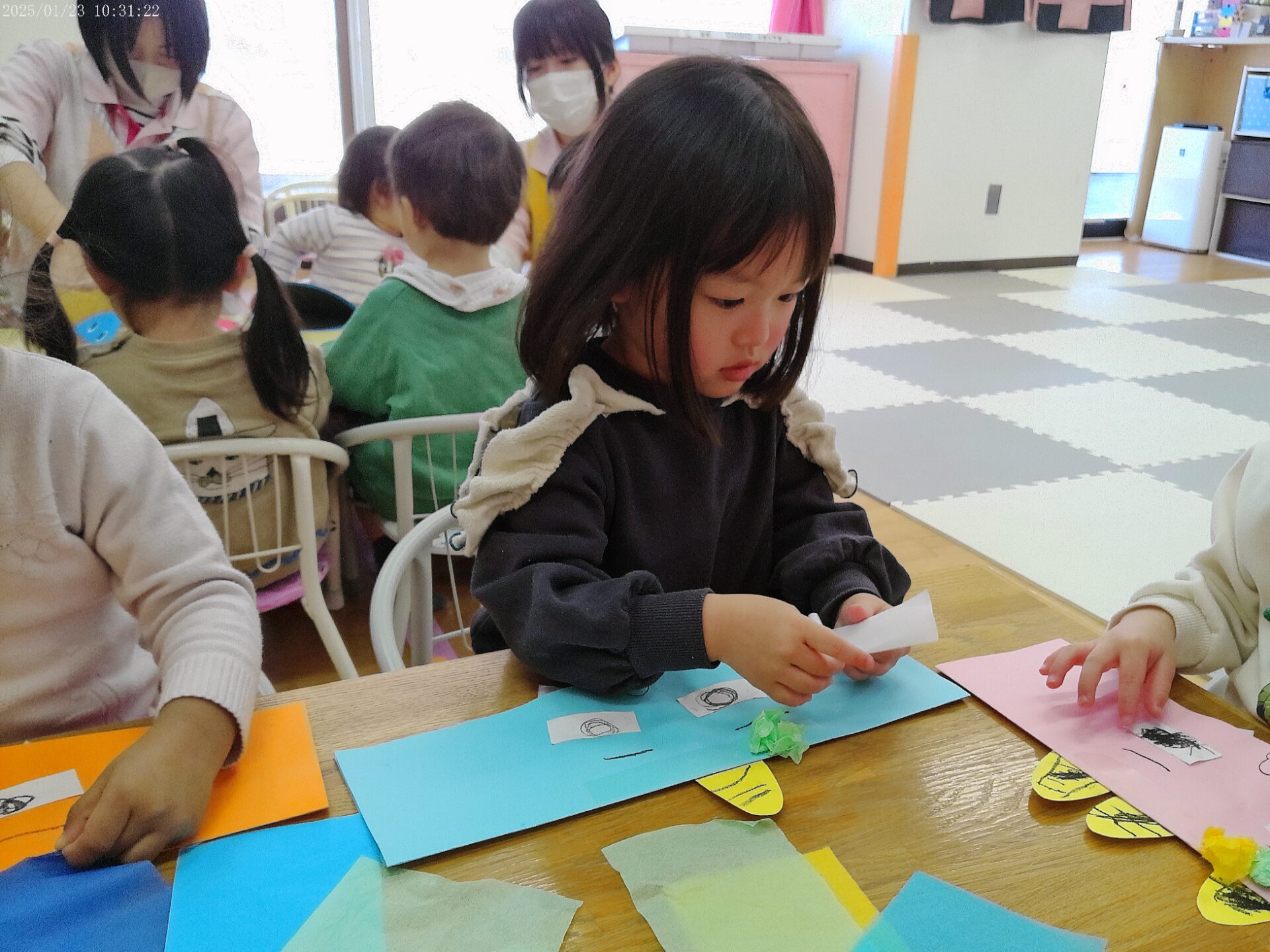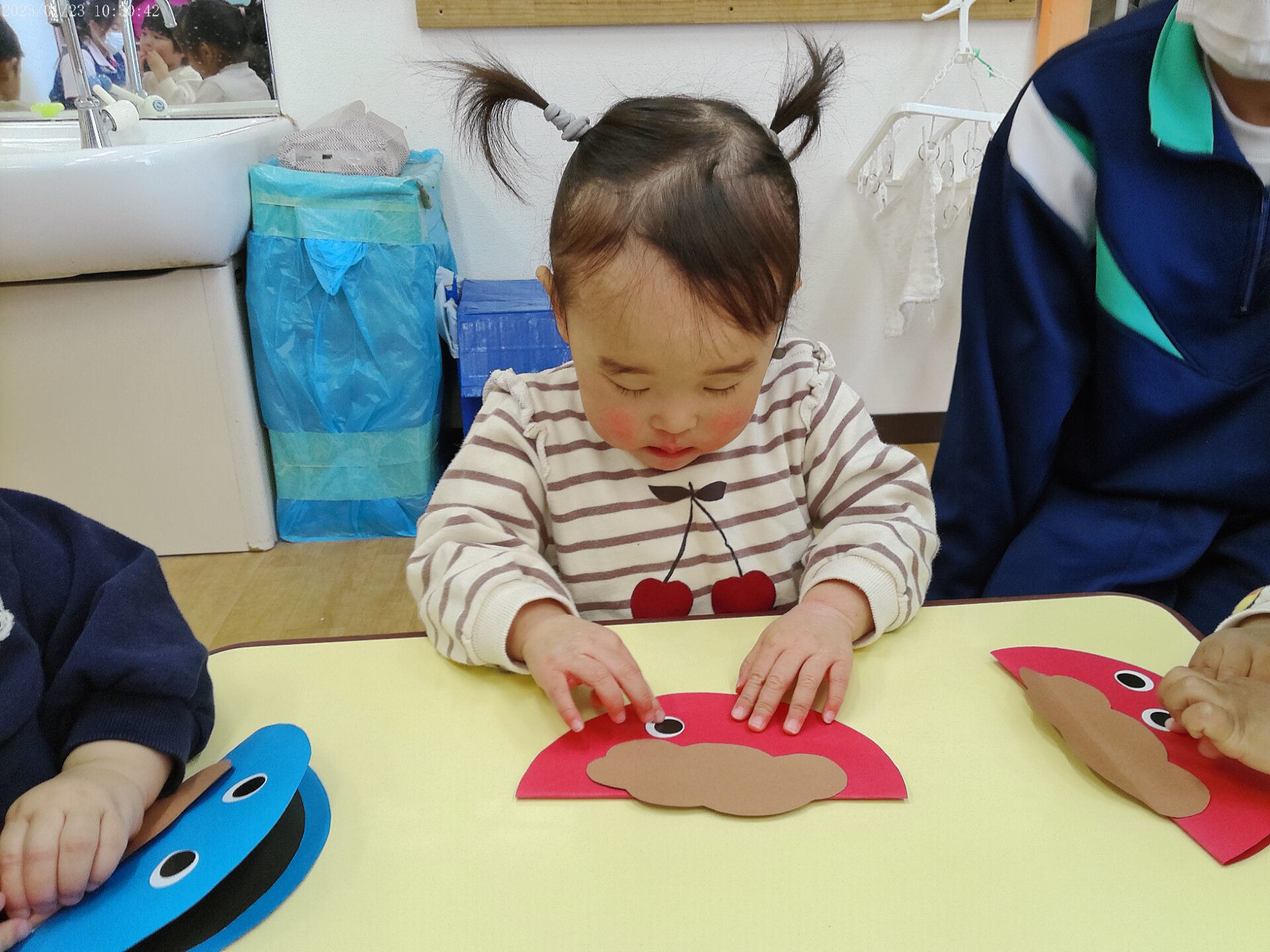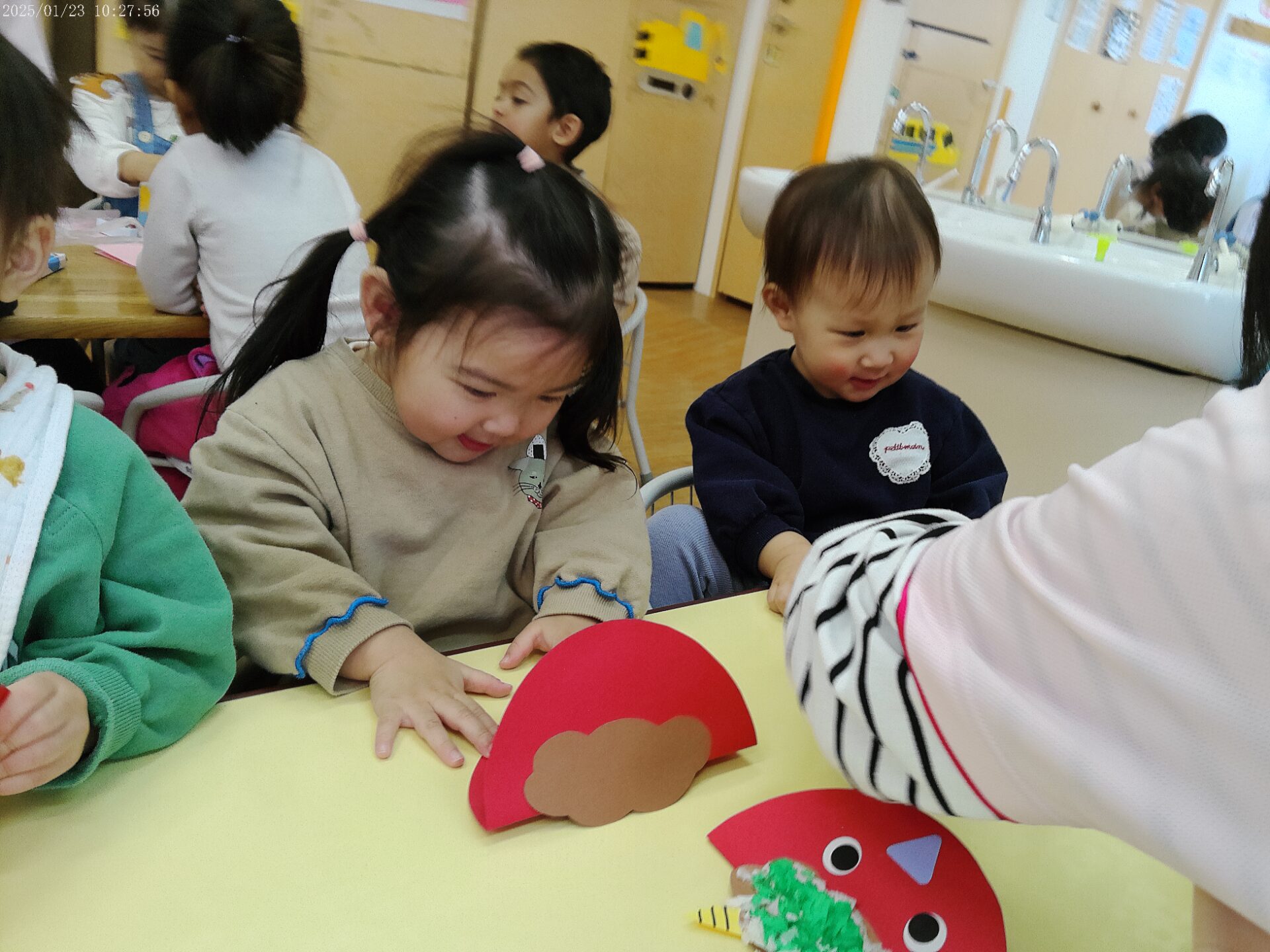 発表会の練習をした後は、こあらぐみさんとうさぎぐみさんは豆まきの製作でオニさんを作りました👹