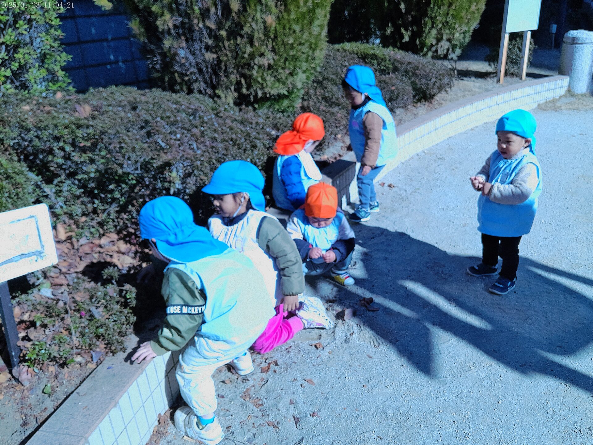 何度も枯葉をくしゃくしゃしたり、お砂をさらさら~っと落として感触を楽しんでいました🍂