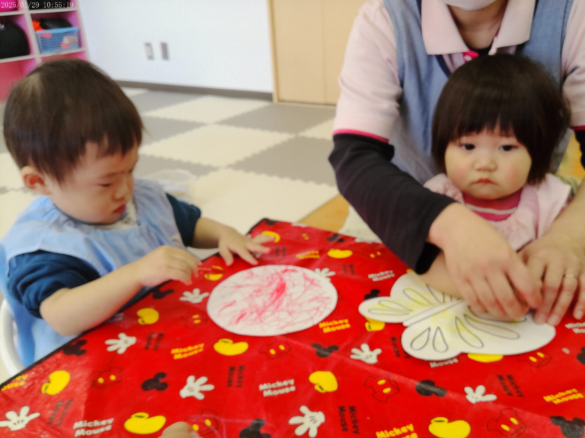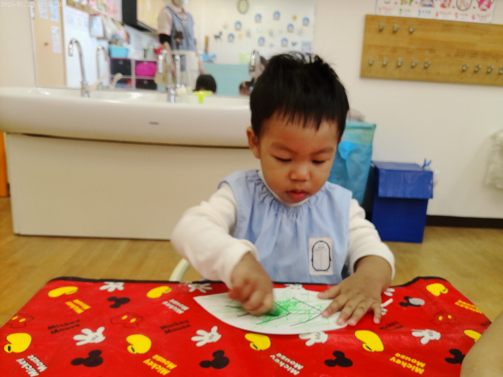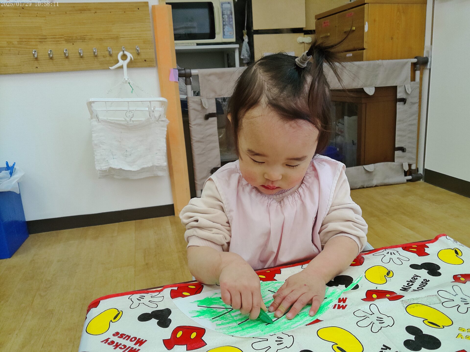 ※お絵描きでクレヨンを使っています。園でも手洗いをして落とせるところは落しましたが、クレヨンの汚れが残っていますので、お風呂で良く洗ってあげてください。