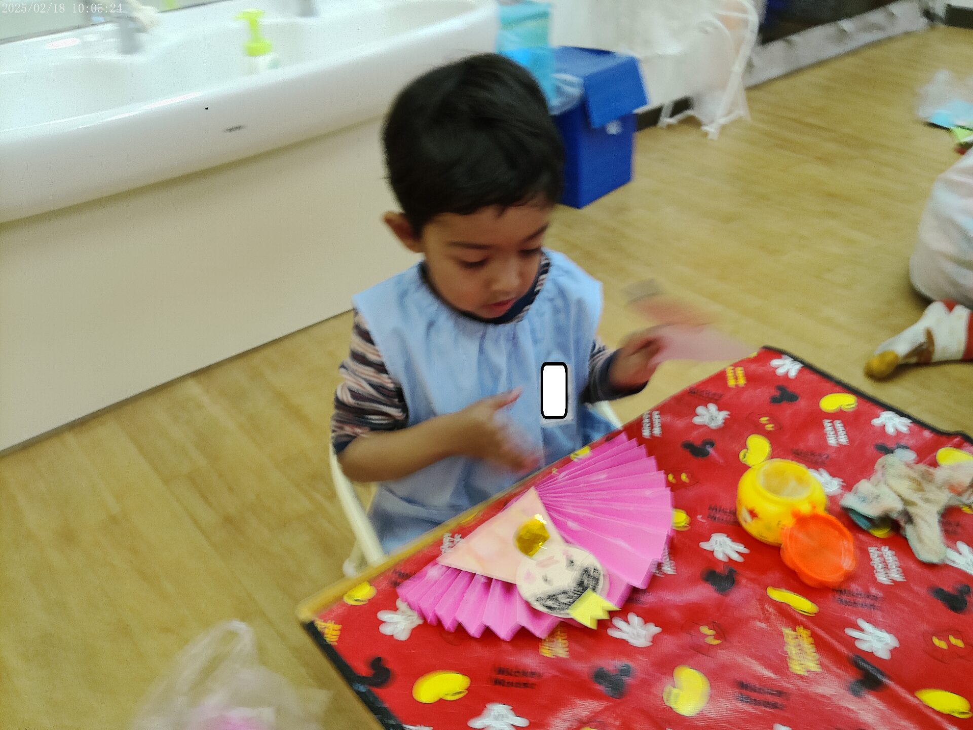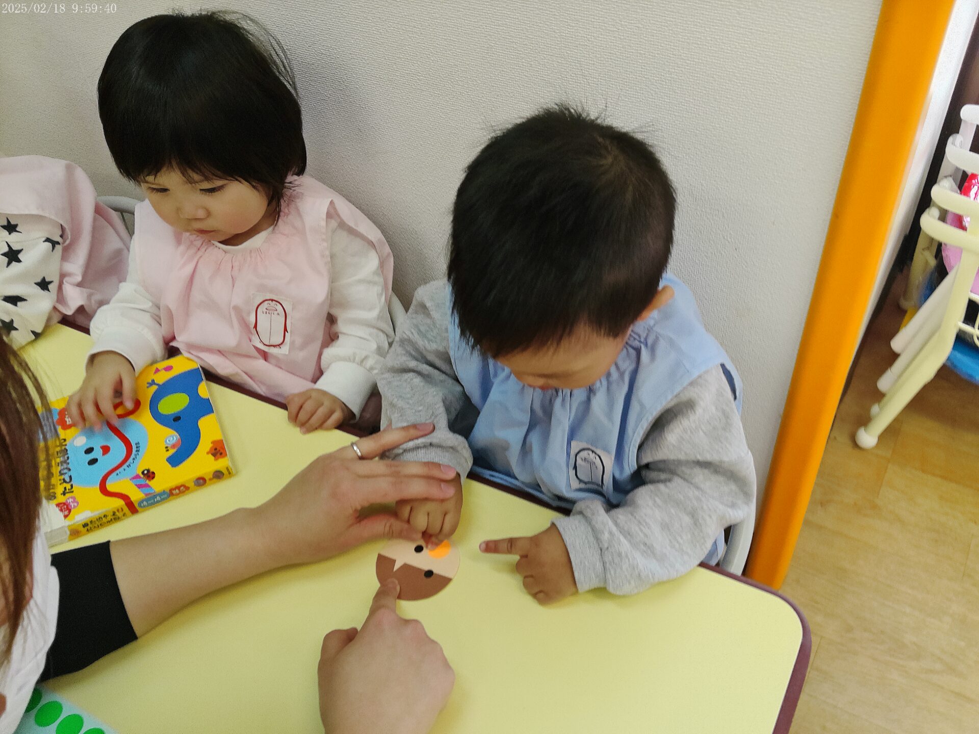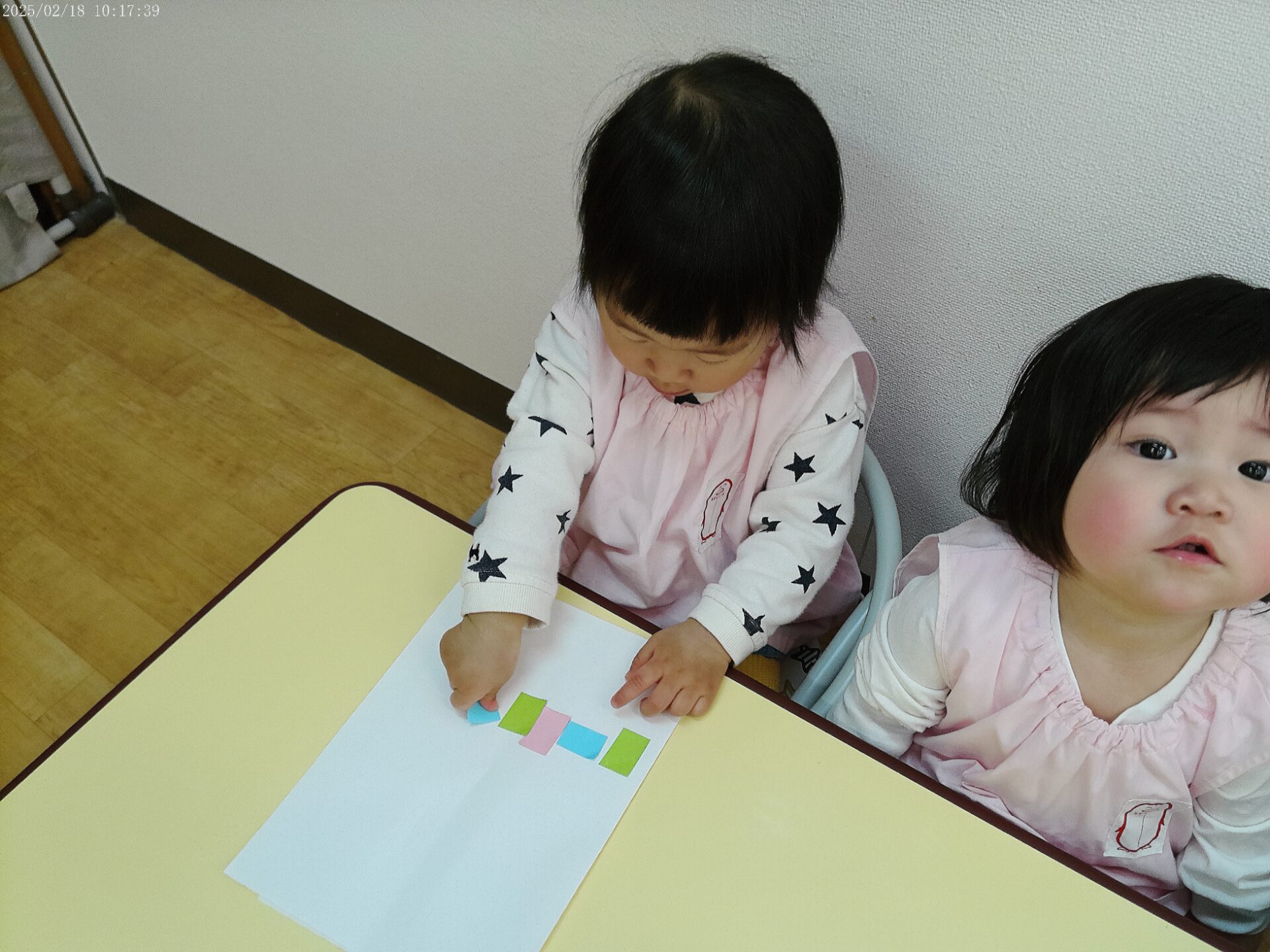 ひよこ組さんは、お顔のシールを貼って、小さな四角い画用紙を貼っていましたよ。待っているのも絵本を見ながら上手です。