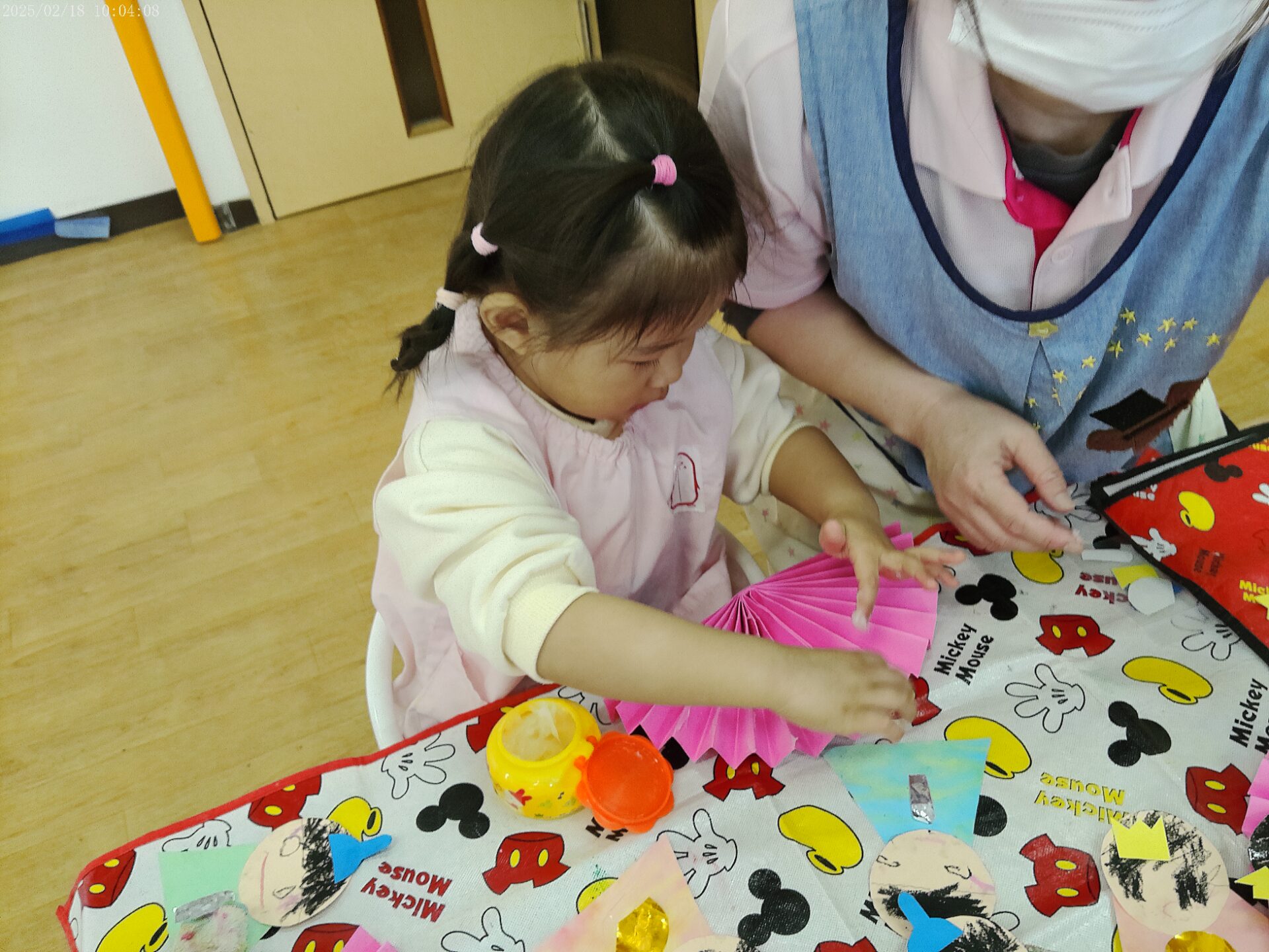 こあら組さんは、えぼしやかんむり、扇、しゃくを貼ってピンクの台紙に貼りました。完成です✨