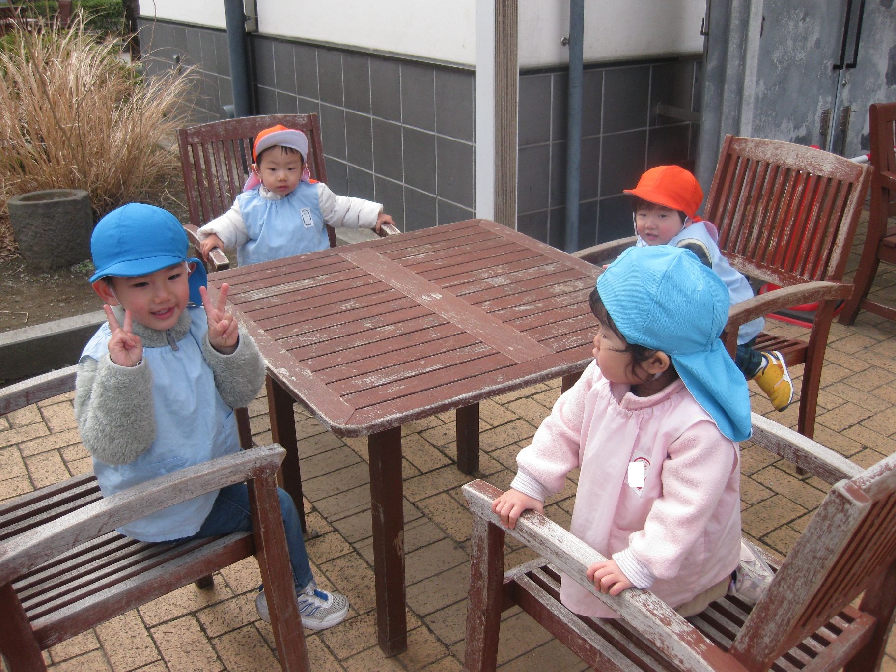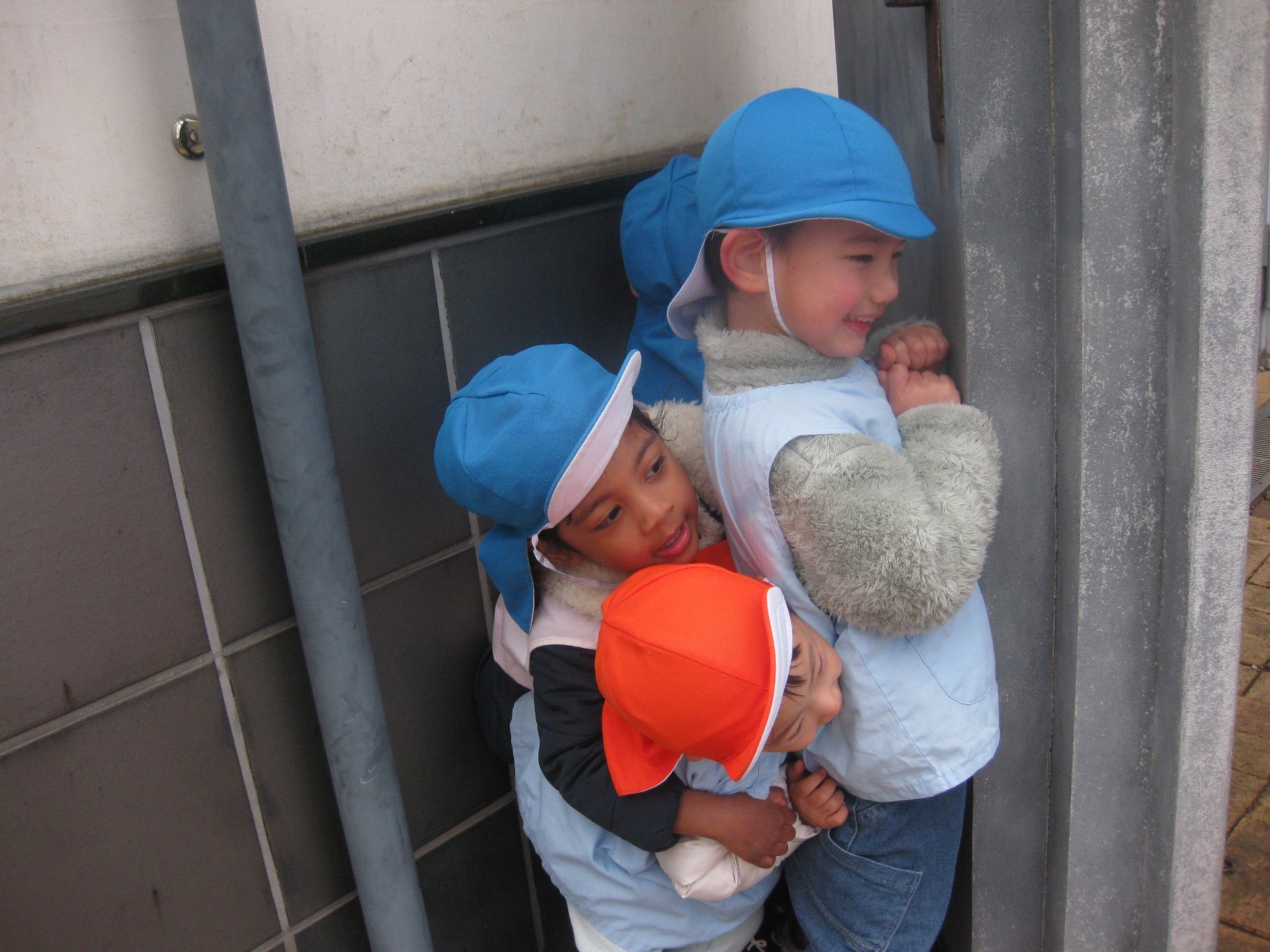 先生に見つからないよう、建物の陰にギューッと集まっている姿をパシャリ📷✨