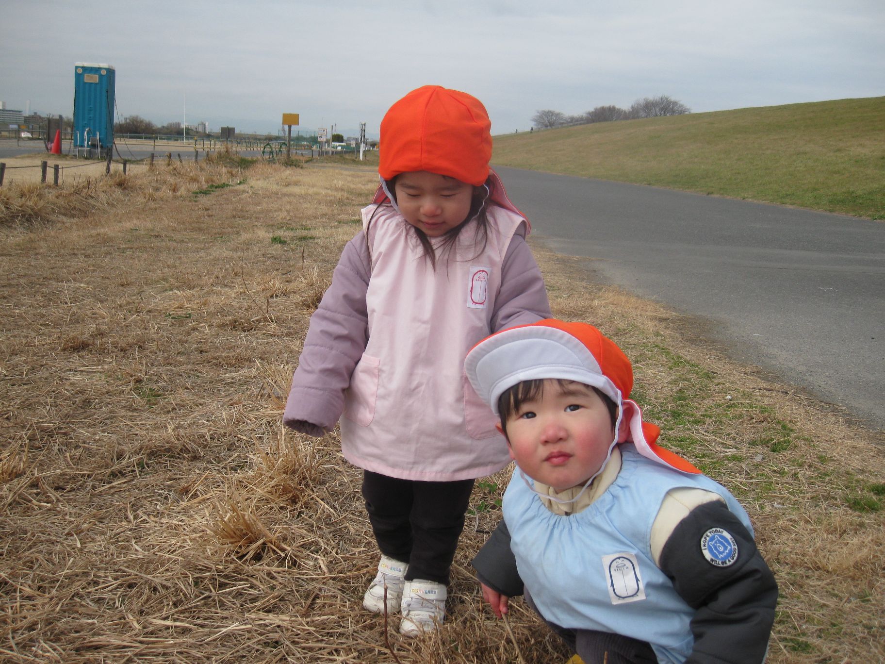 歩道の下の芝生にムクドリがたくさんいる情景を見て「とりさん、いっぱい」と嬉しそうにお話ししていました。ムクドリがまとまって飛んで行ってしまうと、「きゃ~♡行っちゃった~!」と歓声をあげて喜ぶ子どもたちでした😊💕