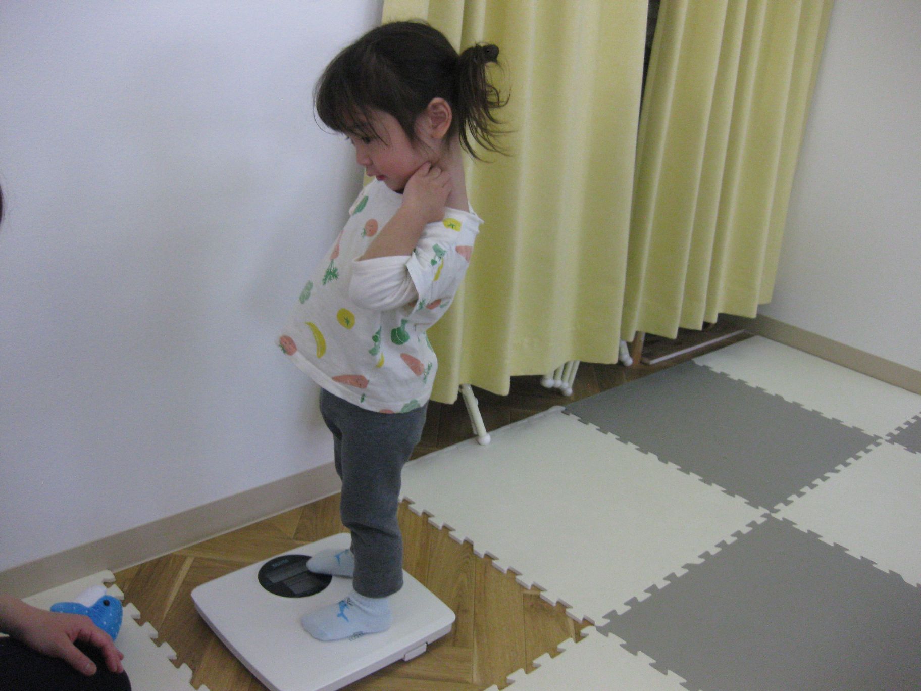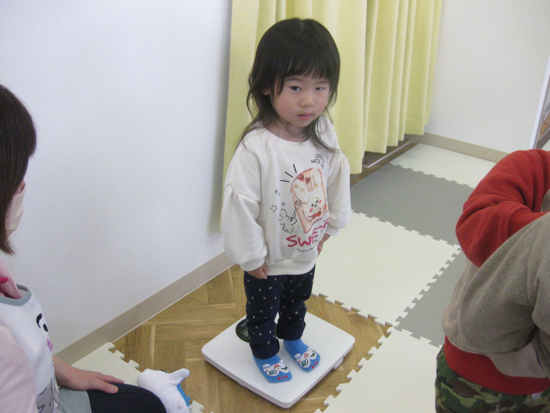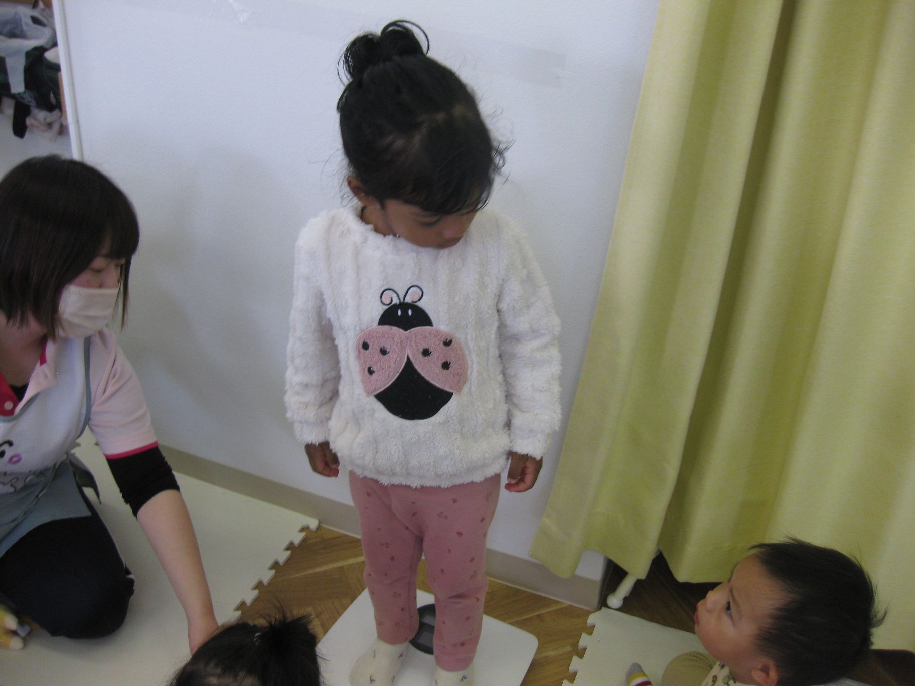 身体測定を待っているお友だちは、先生と一緒に「貨物列車シュッシュッシュ~♪」と歌いながら先生のお膝に座って楽しみましたよ!
