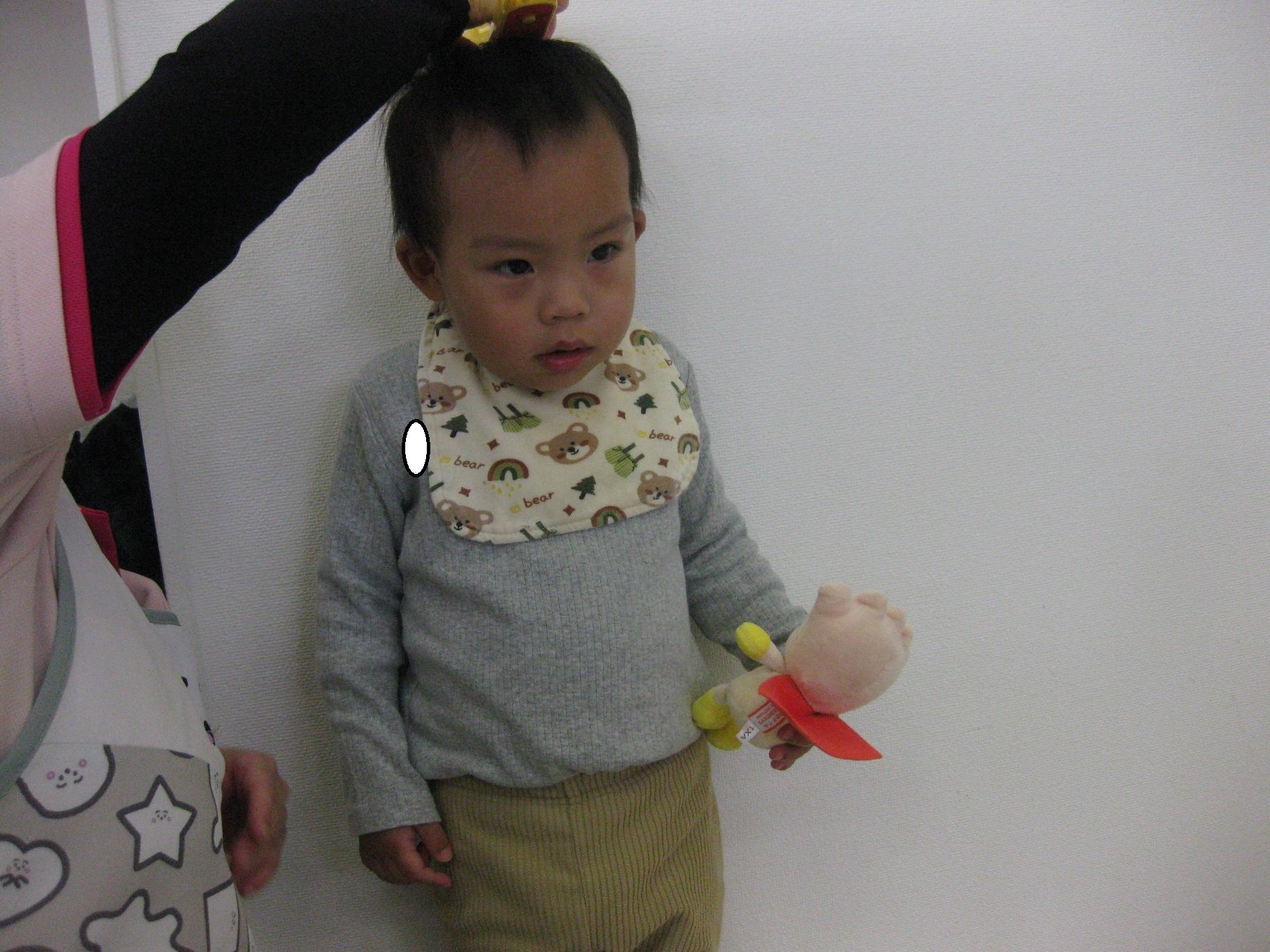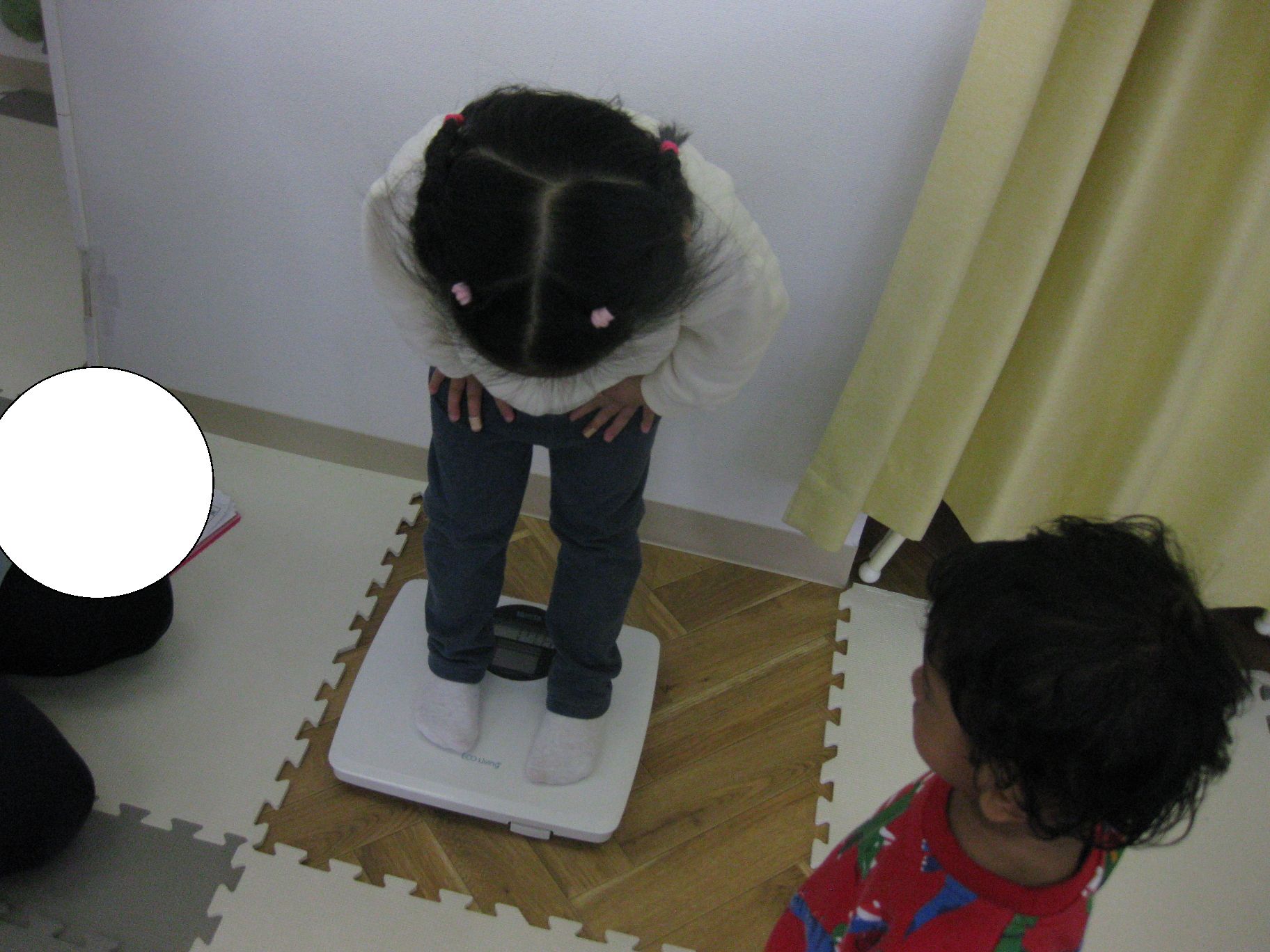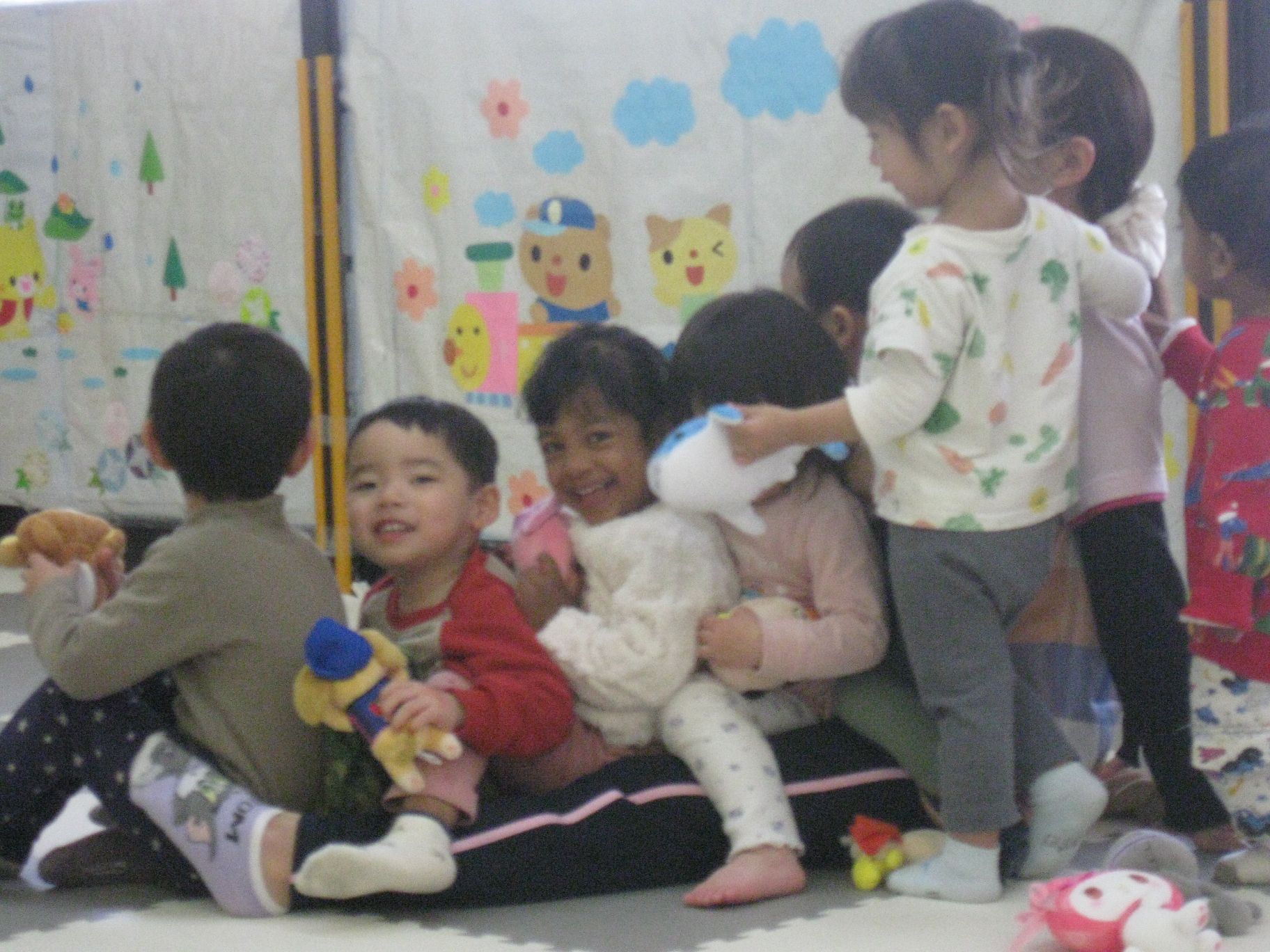 身体測定を待っているお友だちは、先生と一緒に「貨物列車シュッシュッシュ~♪」と歌いながら先生のお膝に座って楽しみましたよ!