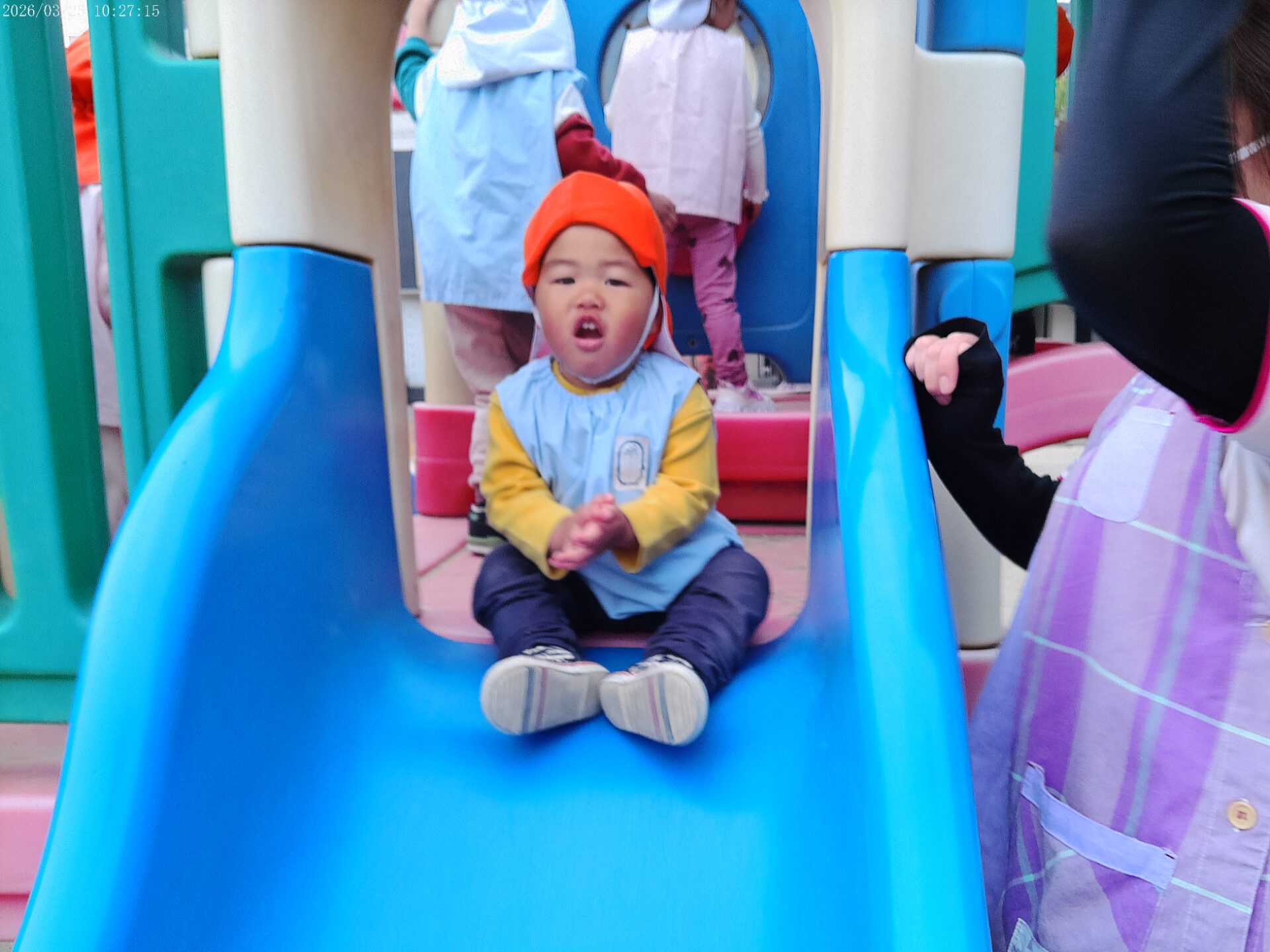 すべり台の勢いがありすぎて、滑り終わった後ドン!としりもちをついてしまうお友達も笑