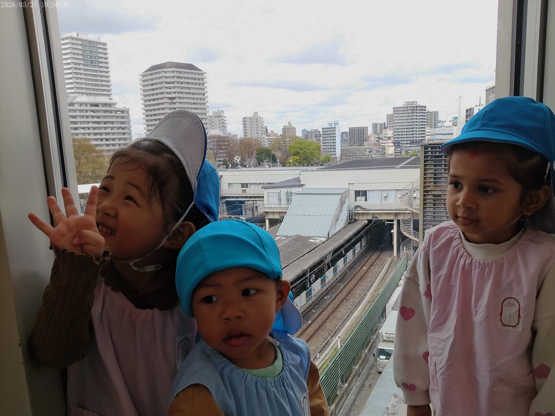 先生にバスがきたことを伝えて「バス!」「きたよ!」と教えてみんな嬉しそうに見ていました。たくさん体を動かした後、キュポラの所にあるビルの行政センターの階に行って、上から電車をみました😊