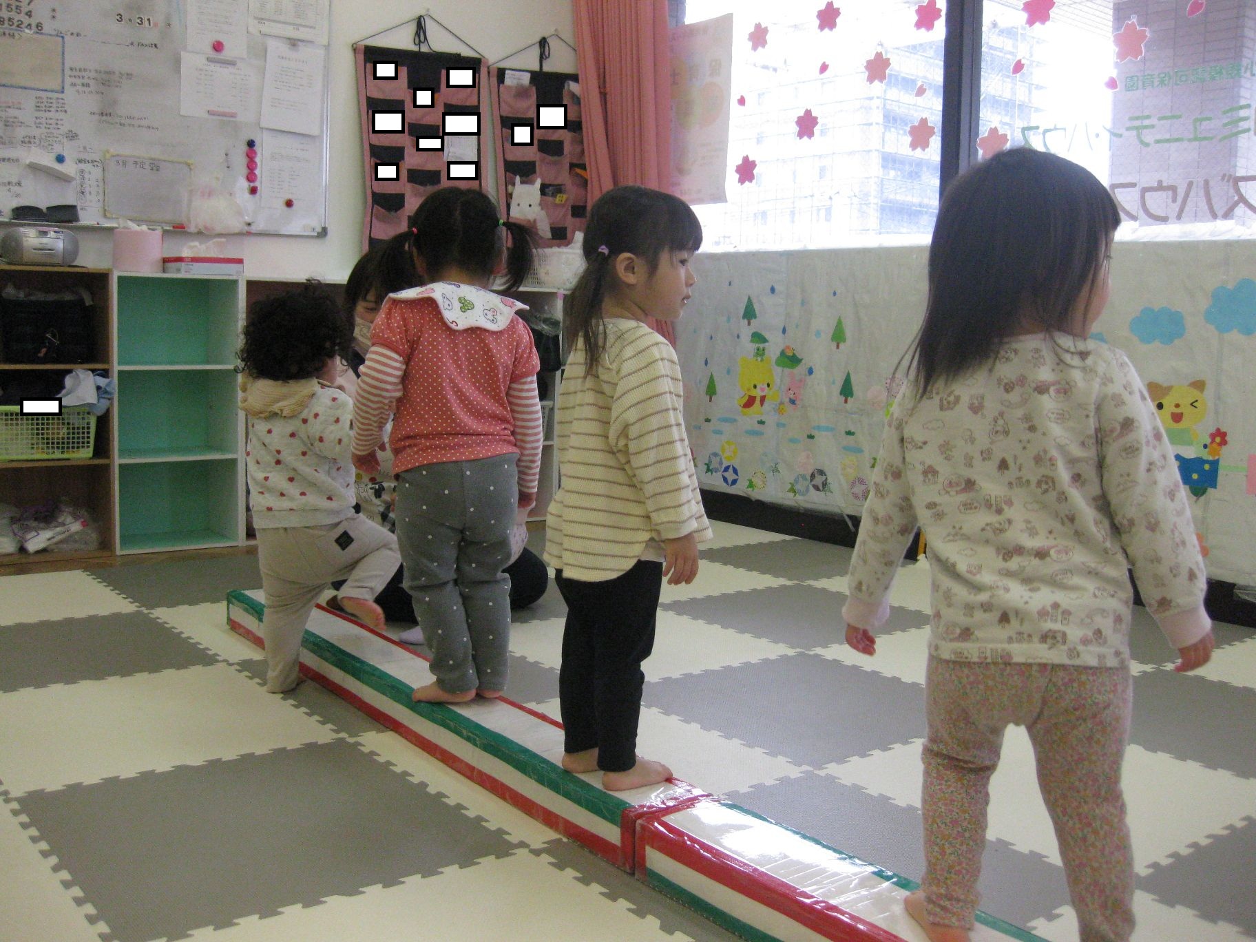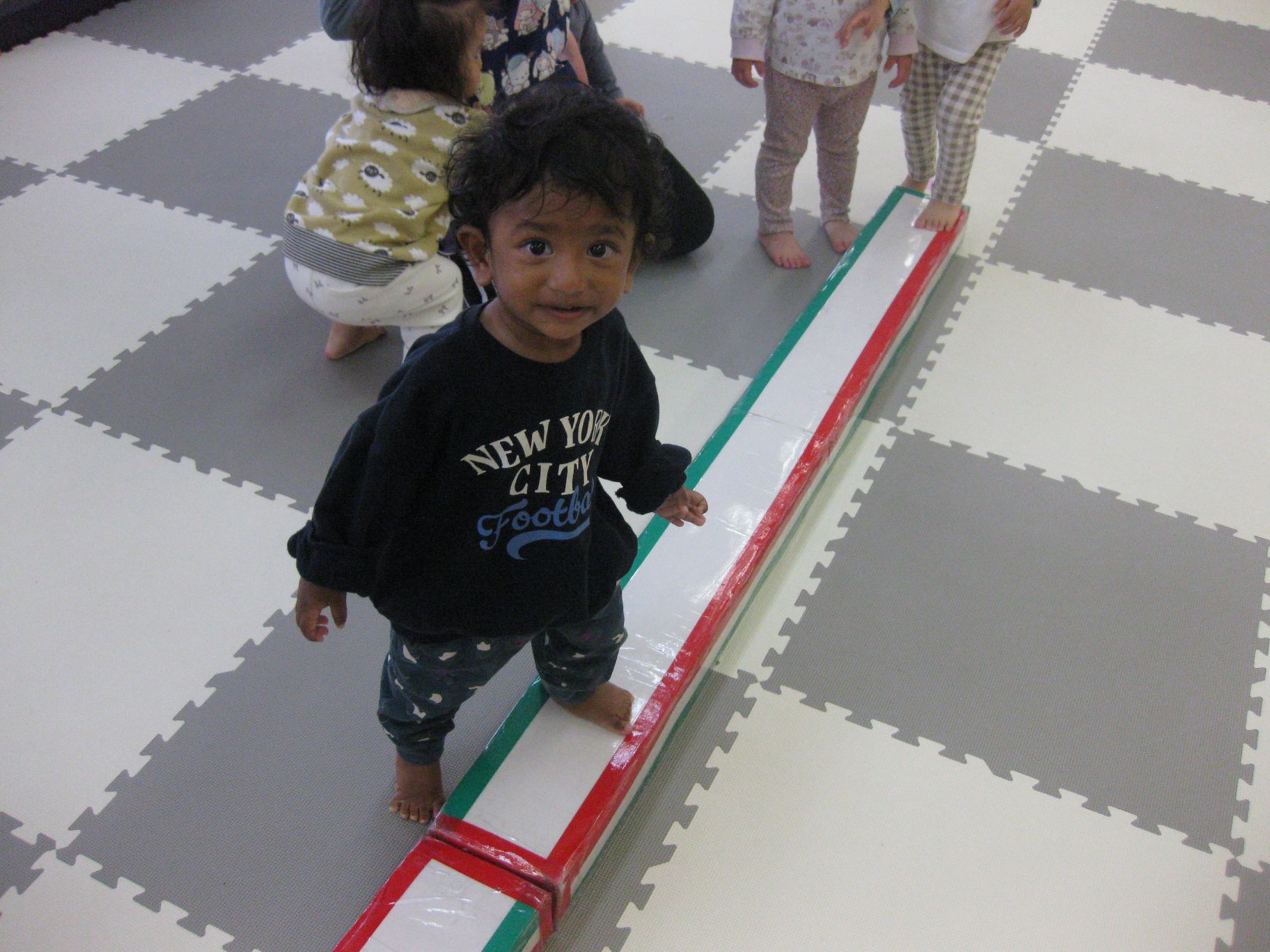 一本橋では、下にサメがいるという設定で落ちないように気を付けながら渡ったり、ハイハイで渡ったりと色々な遊び方で楽しみました😁